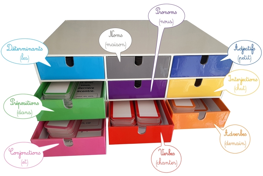 Pour un enseignement actif de la grammaire !Ce matériel innovant permet de chercher, de manipuler, de comparer et d’observer les éléments de la langue française. Il permet également d’en comprendre le fonctionnement en valorisant les activités de recherche, fondées sur le classement et le tri, avec justification et explication des procédures par les élèves à l’oral.Surtout, cette méthode active de manipulation des mots permet aux élèves de se construire progressivement des images mentales qui leur servent à réactiver leurs connaissances et à les mémoriser sur le long terme.Contenu de la boîte :9 TIROIRS colorés contenant des cartes Noms, Déterminants, Adjectifs qualificatifs, Pronoms, Verbes, Adverbes, Interjections, Prépositions, Conjonctions340 étiquettes MOT classées par nature grammaticales (+ 24 étiquettes MOT vierges)20 étiquettes LETTRE qui permettent de matérialiser les différentes terminaisons (terminaisons des verbes et des participes passés, et marques du féminin et du pluriel)9 cartes DÉFINITION qui assurent une bonne compréhension des spécificités de chaque mot, de chaque classe grammaticale10 cartes OUTILS qui sont des aides mnémotechniques indis-pensables à la construction de l’ensemble des connaissances inhérentes aux classes de mots18 fiches d'ACTIVITÉS recto verso pour un apprentissage évolutif de l’Étude de la langue11 affiches LEÇON pour un affichage de référenceUn cahier personnel de l’élève pour garder une trace écrite du travail de recherche, de questionnement, de confrontation mené en séances collectives