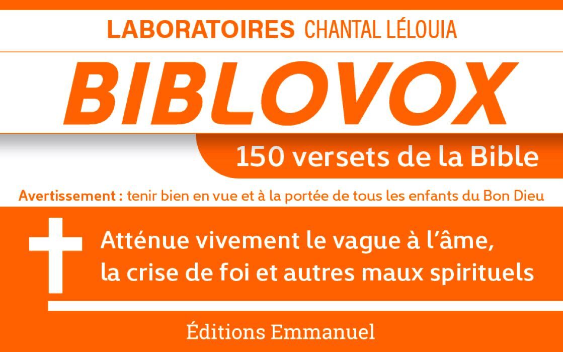 Les laboratoires Chantal Lélouia ont rassemblé 150 versets de la Bible dans une boîte de médicament efficace contre tous les maux (spirituels) : vague à l'âme, crise de foi, souffle au coeur...Alors que le marché de la Bible est florissant et que l'évangélisation a le vent en poupe, ce petit bloc contient 150 versets de la Bible détachables à garder précieusement ou à distribuer largement !NB : La première et la dernière page sont imaginées autour du concept de la boîte de médicament, mais ce n'est pas le cas du reste des cartes.
