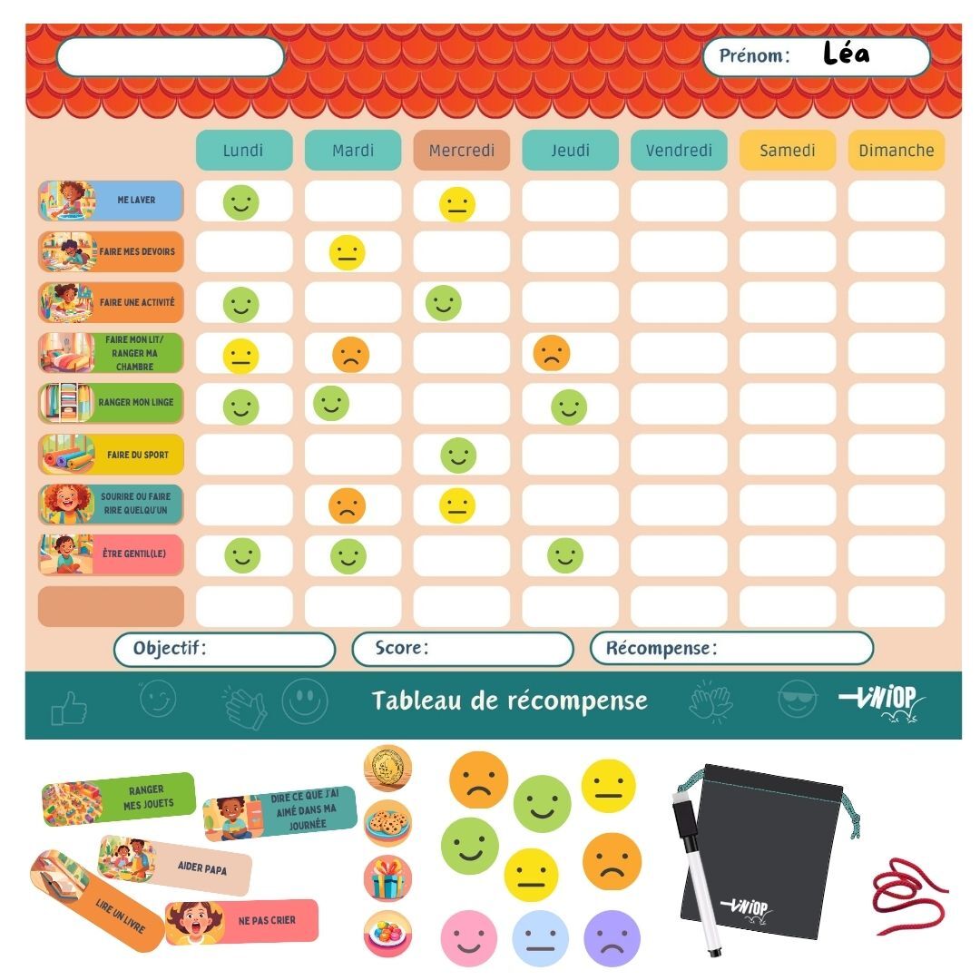 Un tableau magnétique conçu pour motiver les enfants à suivre leurs routines quotidiennes et hebdomadaires tout en développant leur autonomie Avec plus de 170 aimants illustrés ce planificateur visuel encourage les comportements positifs et responsabilise l’enfant dans ses tâches quotidiennes