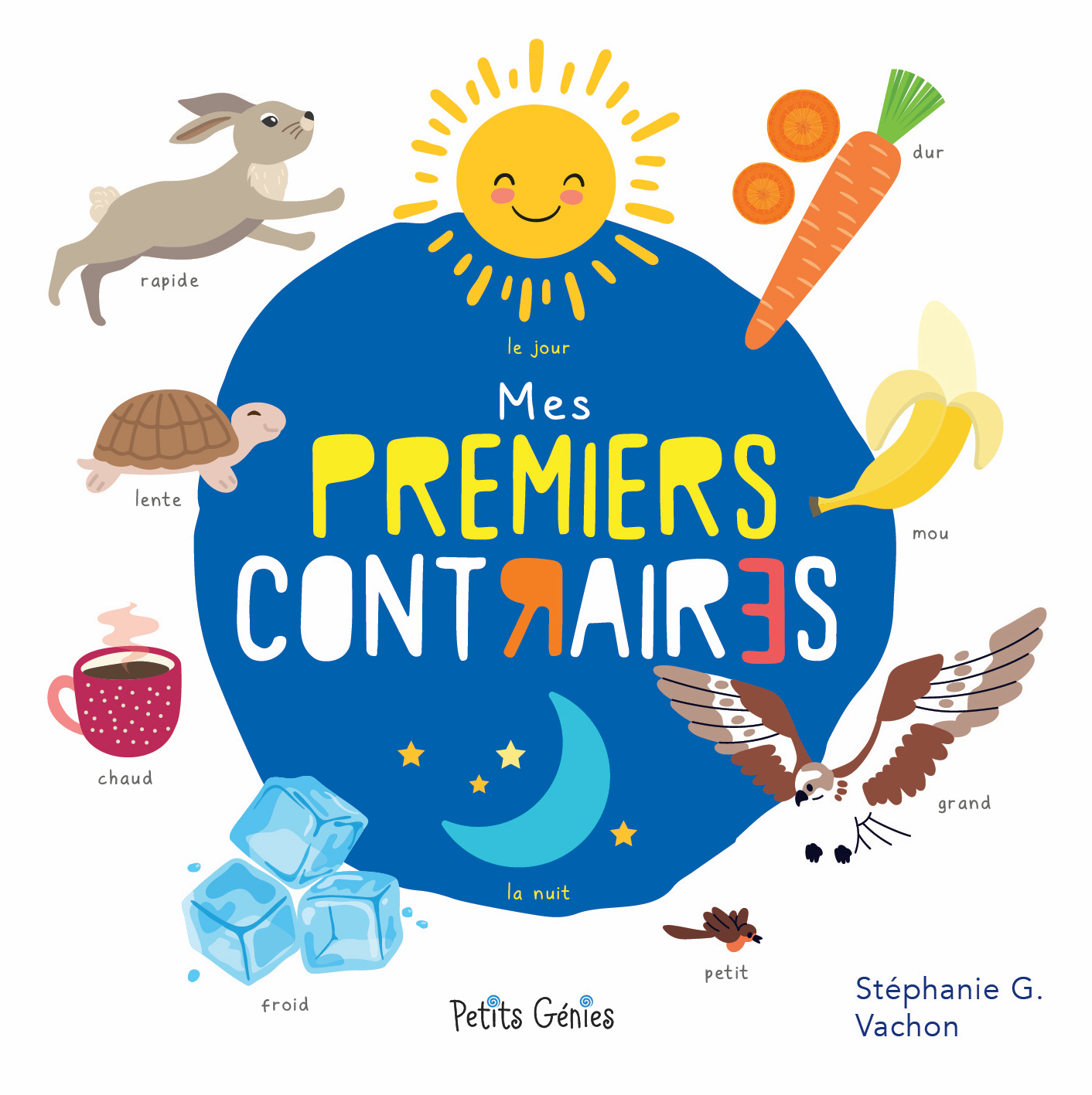 Ce livre aux illustrations dynamiques et colorées apprendra aux enfants à nommer et qualifier les différents contraires issus de leur quotidien.
