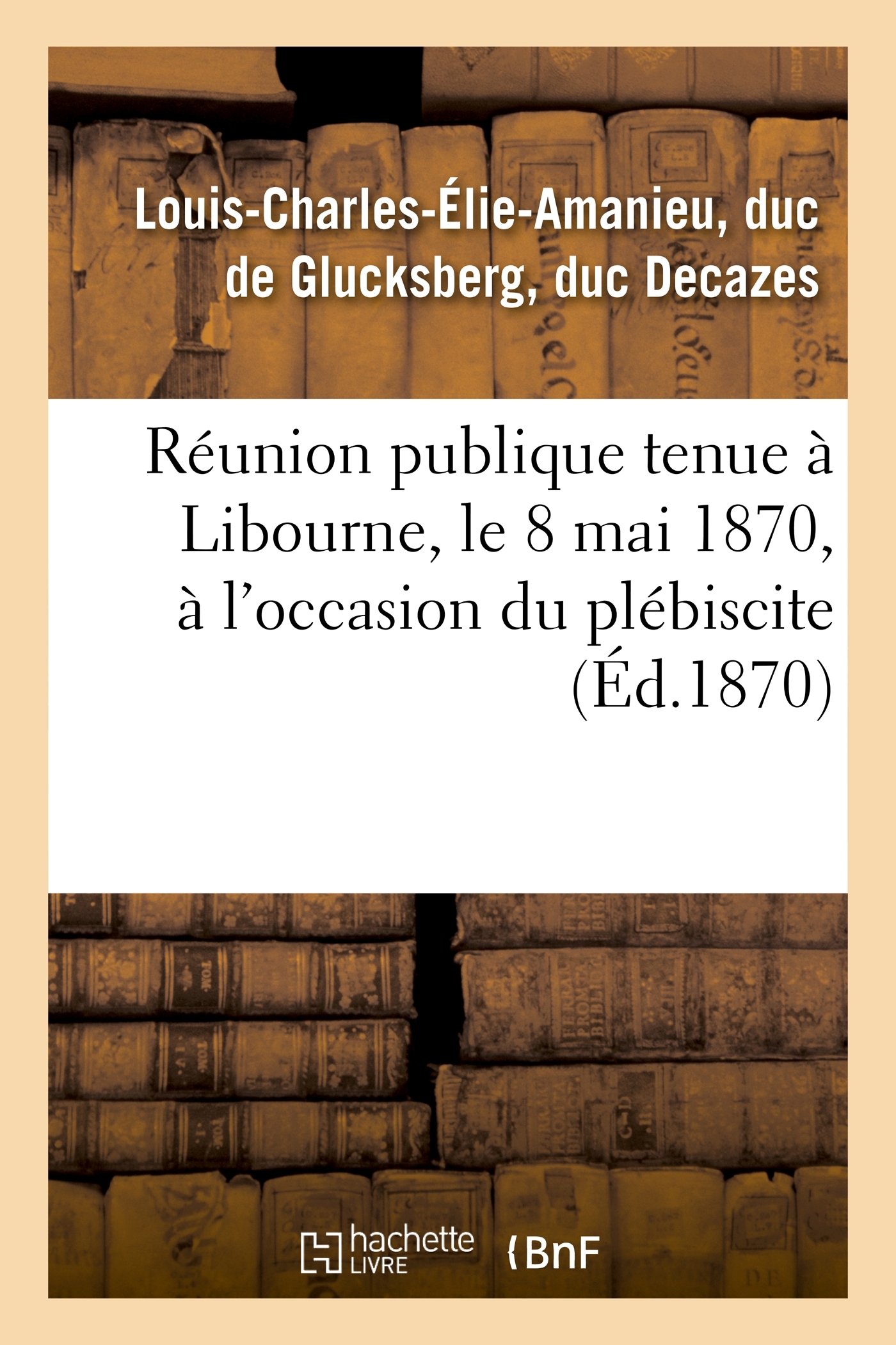 Réunion publique tenue à Libourne, le 8 mai 1870, à l'occasion du plébiscite. (Discours du duc Decazes.)Date de l'édition originale : 1870Le présent ouvrage s'inscrit dans une politique de conservation patrimoniale des ouvrages de la littérature Française mise en place avec la BNF.HACHETTE LIVRE et la BNF proposent ainsi un catalogue de titres indisponibles, la BNF ayant numérisé ces œuvres et HACHETTE LIVRE les imprimant à la demande.Certains de ces ouvrages reflètent des courants de pensée caractéristiques de leur époque, mais qui seraient aujourd'hui jugés condamnables.Ils n'en appartiennent pas moins à l'histoire des idées en France et sont susceptibles de présenter un intérêt scientifique ou historique.Le sens de notre démarche éditoriale consiste ainsi à permettre l'accès à ces œuvres sans pour autant que nous en cautionnions en aucune façon le contenu.Pour plus d'informations, rendez-vous sur www.hachettebnf.fr