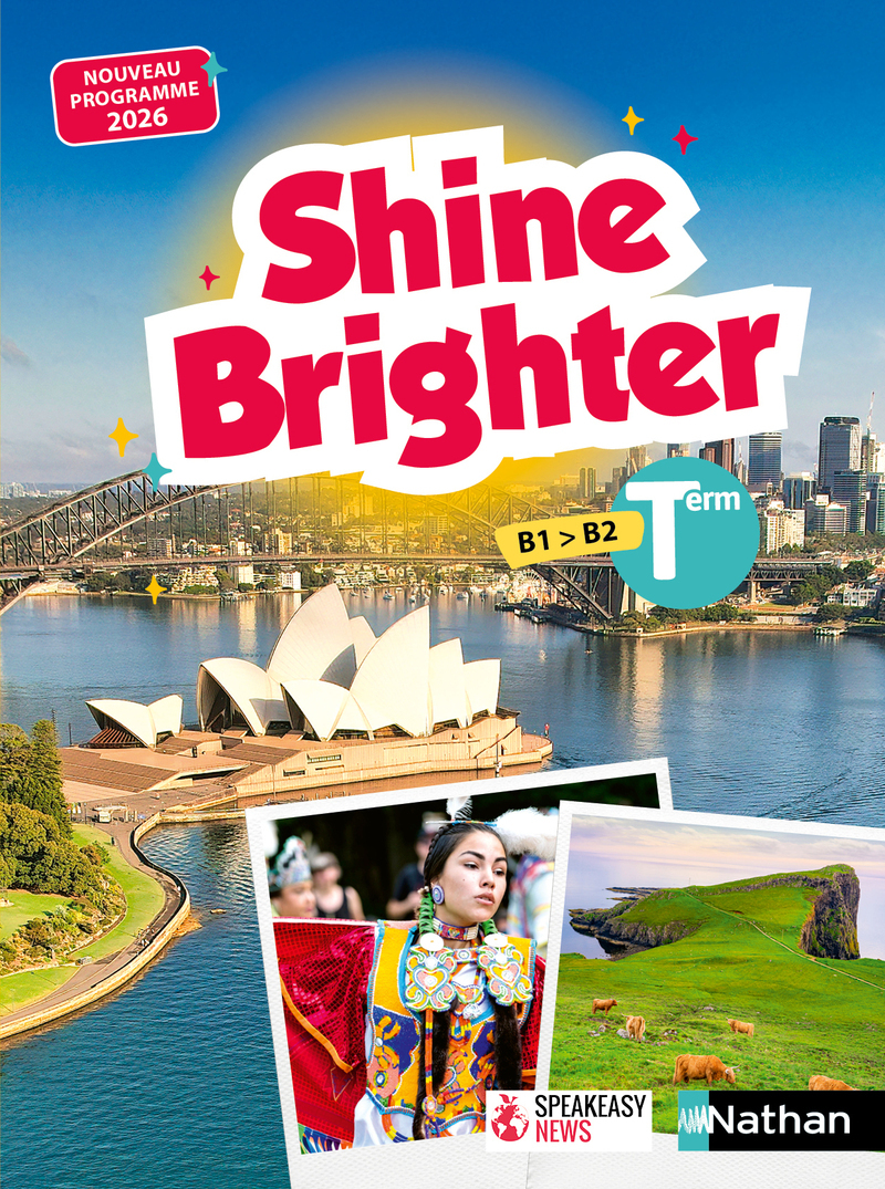 Shine Brighter Terminale : lemanuel d'anglais complet pour faire progresser les élèves avec méthode et confiance. NOUVEAU ! Votre manuel devient bimédia (livre + licence numérique offerte). ► OFFRE SPÉCIALE ADOPTANTS ! Les manuels numériques pour vos élèves sont OFFERTS pour 5 ans (version en ligne - offre valable jusqu'au 31/12 de la 1re année d'adoption) si vos classes sont équipées du manuel papier. → à commander gratuitement sur cns-edu.com ♦ Ce manuel est 100% conforme au programme 2025 publié au B.O. du 29.05.2025 ♦ Avec Shine Brighter Terminale, vous proposez à vos élèves un manuel riche, motivant et structuré, parfaitement conforme aux nouveaux programmes . Tout ce que vous aurez en choisissant Shine Brighter Terminale pour travailler avec vos élèves : Un large choix de chapitres pour couvrir l'intégralité du programme → 24 chapitres pour s'adapter au rythme des classes et aux projets pédagogiques. 4 formats de chapitres , pour diversifier les pratiques → Files , Short Files , Snapfiles et Flash Files pour traiter certains thèmes plus rapidement, favoriser le travail de groupe et la remédiation. Des thématiques actuelles, variées et engageantes → sociétales, culturelles, artistiques, scientifiques ou géopolitiques, en lien avec les centres d'intérêt des élèves. Des documents authentiques riches et récents , adaptés au niveau Terminale → textes plus longs qu'en 1re, davantage de documents littéraires, et une large ouverture à l'ensemble du monde anglophone. Une grande variété d'approches pédagogiques → Teamwork , différenciation des apprentissages, à l'oral comme à l'écrit. Un travail de la langue solide et structuré ( Build your English ) → grammaire en infographies, phonologie dédiée, lexique clairement organisé pour faciliter la mémorisation. Un dispositif complet pour l'évaluation et le développement des compétences → pages Practise & Shine ciblant toutes les activités langagières, grilles CECRL, évaluations et outils clés en main. Des exercices pour s'entraîner aux tests standardisés d'anglais Une maquette claire, moderne et rassurante → structure récurrente, balisage lisible, pour accompagner efficacement enseignants et élèves tout au long de l'année. Et toutes les ressources numériques... Plus de 100 vidéos et audios authentiques Les textes lus et tous les audios des pages Vocabulary et Phonology Des activités numériques pour mémoriser et s'auto‑évaluer ( Memorise your vocabulary , Test yourself ) Les fiches téléchargeables du e‑workbook pour la différenciation et l'auto-évaluation Les liens A little extra pour aller plus loin ► SPÉCIAL ACCESSIBILITÉ : les scripts des audios et vidéos et tous les documents textes en version adaptée pour les élèves DYS et/ou en audio. + pour l'enseignant uniquement : Le guide pédagogique complet avec des évaluations supplémentaires en CO et CE, grilles et outils...