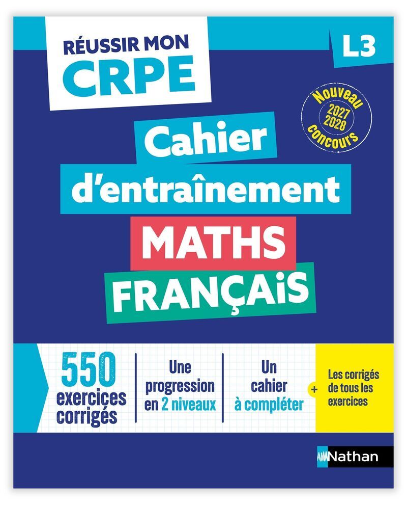 Découvrez le nouveau cahier d'entrainement L3 Maths/Français pour préparer les épreuves Oral et Écrit du Concours de Professeur des Écoles (CRPE) 2027-2028. Conforme programme 2025. Descriptif - Un cahier d'exercices à compléter pour s'entrainer efficacement, aussi bien pour l'écrit que pour l'oral. - Un parcours complet en Maths et en Français pour bien réviser tout au long de l'année.