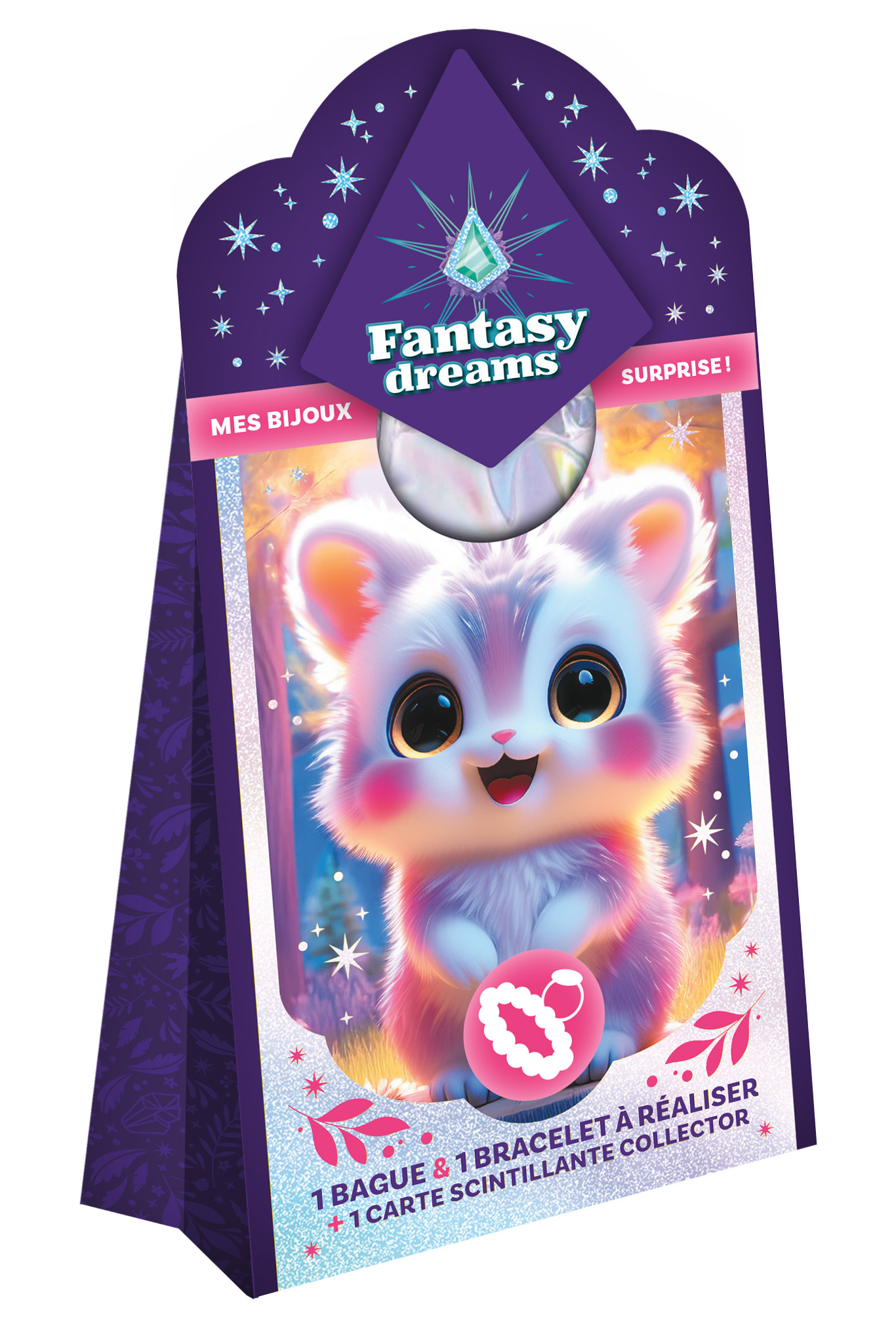 Cette boîte mystère renferme un bracelet et une bague à confectionner, mais aussi une carte scintillante représentant un animal trop mignon.Bloom, Lumi, Tahia ou Nova ? Cœur, flocon, étoile ou fleur ? À chaque créature son symbole et des bijoux différents.