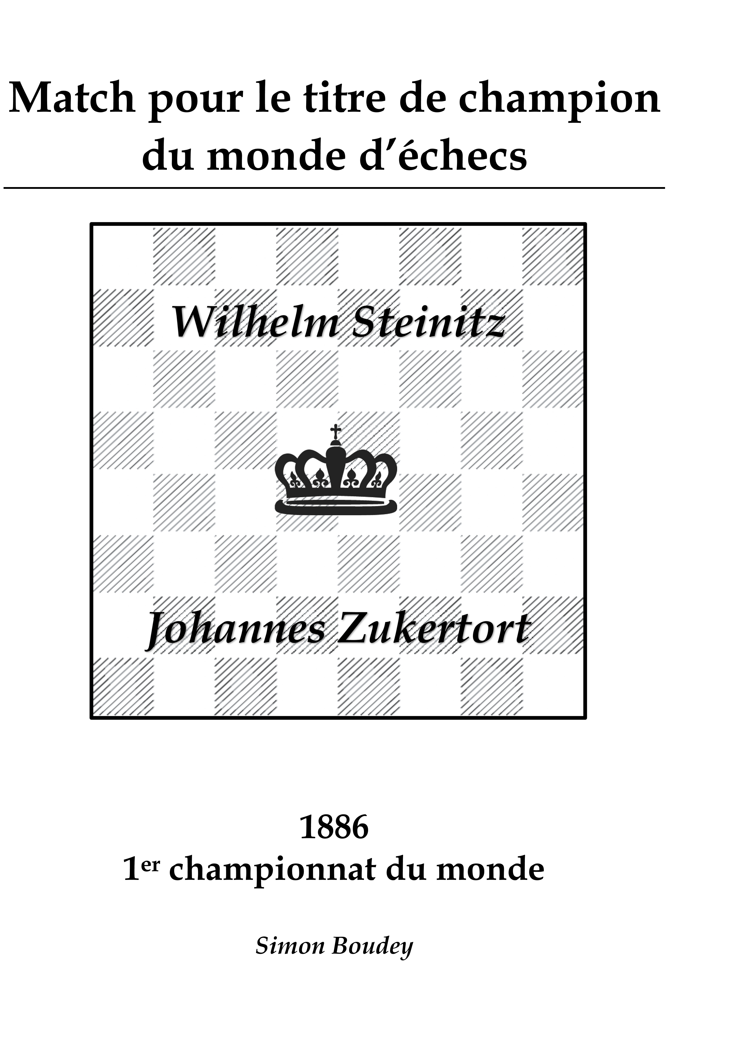 Ce livre reprend les vingt parties du Championnat du monde de 1886 entre Wilhelm Steinitz et Johannes Zukertort dans leur intégralité. Elles sont toutes analysées et commentées, le but étant de pouvoir fournir un matériel accessible et compréhensible pour un joueur de club.Les parties du Championnat du monde ont toujours été une source importante de connaissances et elles ont joué un rôle majeur dans le développement du jeu d'échecs. Même si ces parties ont maintenant plus d'un siècle elles restent encore importantes à connaitre et à comprendre pour le joueurs voulant augmenter leur compréhension ainsi que leur culture du jeu.