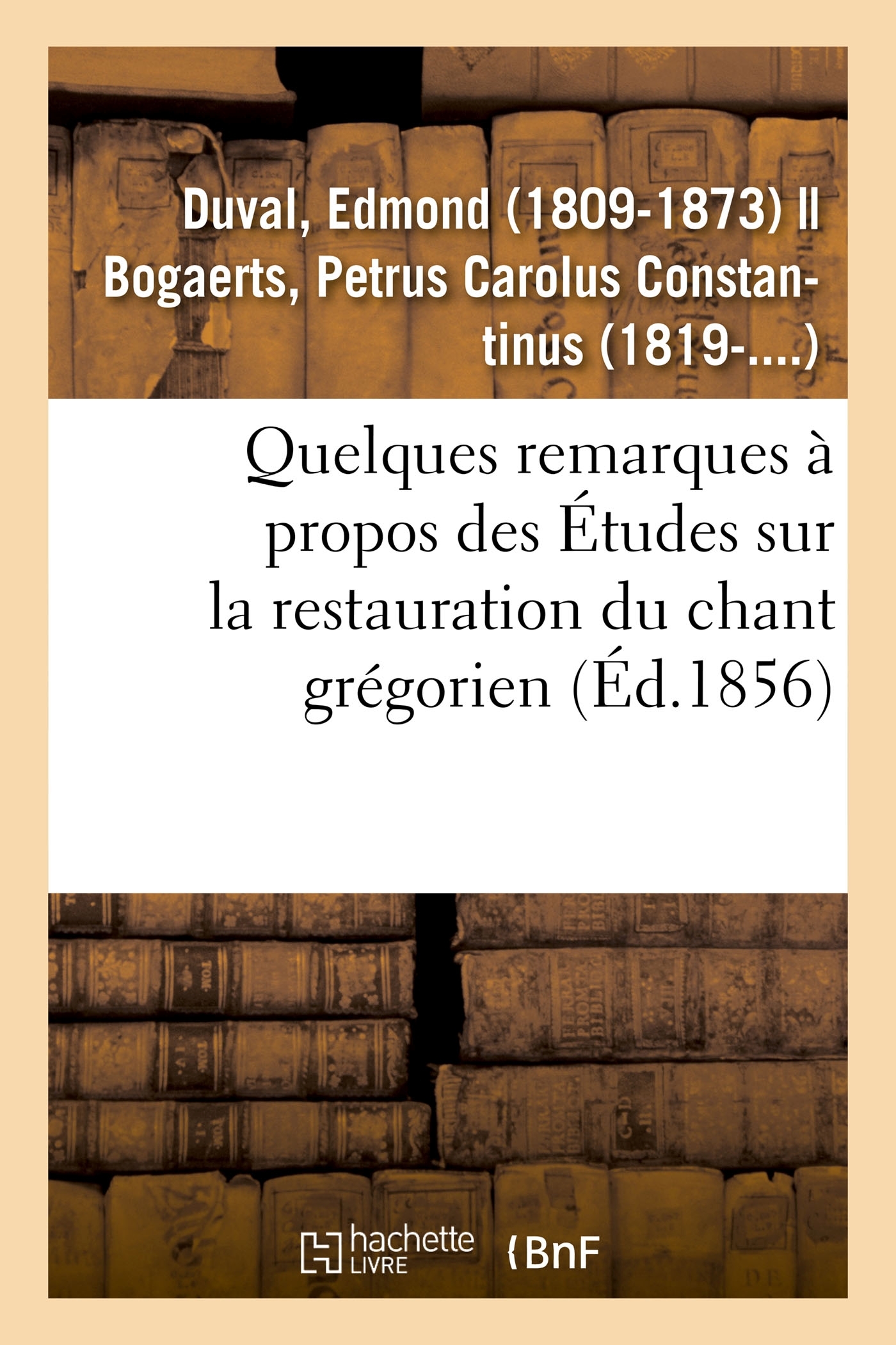 Quelques remarques à propos des "Études sur la restauration du chant grégorien", par M. Th. Nisard, et du "Précis historique sur la restauration des livres de chant grégorien", par Mgr Alfieri, par P.-C.-C. Bogaerts,... et E. DuvalDate de l'édition originale : 1856Le présent ouvrage s'inscrit dans une politique de conservation patrimoniale des ouvrages de la littérature Française mise en place avec la BNF. HACHETTE LIVRE et la BNF proposent ainsi un catalogue de titres indisponibles, la BNF ayant numérisé ces oeuvres et HACHETTE LIVRE les imprimant à la demande. Certains de ces ouvrages reflètent des courants de pensée caractéristiques de leur époque, mais qui seraient aujourd'hui jugés condamnables. Ils n'en appartiennent pas moins à l'histoire des idées en France et sont susceptibles de présenter un intérêt scientifique ou historique. Le sens de notre démarche éditoriale consiste ainsi à permettre l'accès à ces oeuvres sans pour autant que nous en cautionnions en aucune façon le contenu. Pour plus d'informations, rendez-vous sur www.hachettebnf.fr