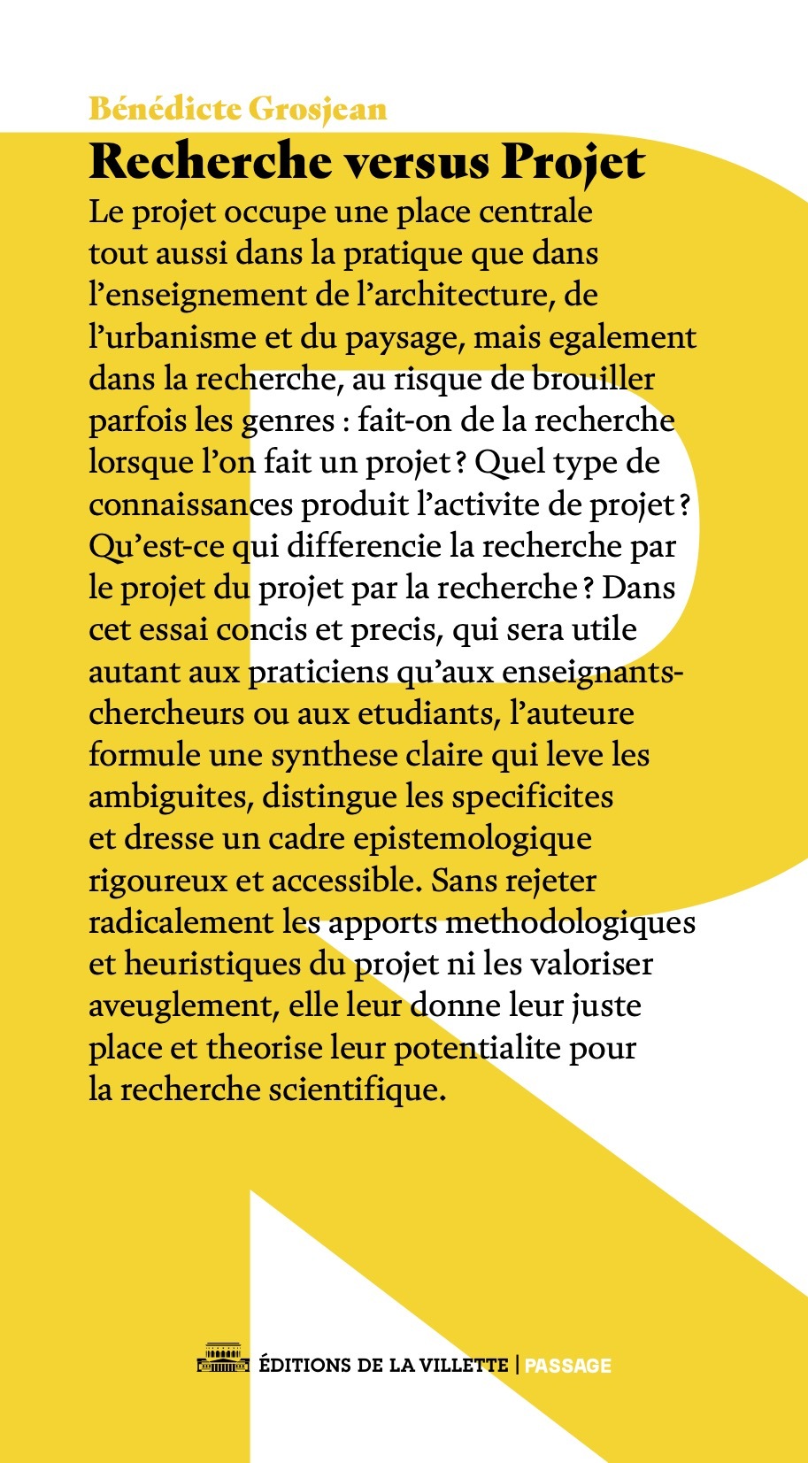En architecture, en urbanisme ou en paysage, domaines dont la finalité est la conception de l’espace, le « projet » occupe une place centrale tant dans la pratique et dans l’enseignement que dans la recherche, au risque de brouiller parfois les genres : fait-on de la recherche lorsque l’on fait un projet ? Quel type de connaissances produit l’activité de projet ? Qu’est-ce qui différencie la recherche par le projet du projet par la recherche ? Dans cet essai concis et précis, qui sera utile autant aux praticiens qu’aux enseignants-chercheurs ou aux étudiants, Bénédicte Grosjean formule une synthèse claire qui lève les ambiguïtés, distingue les spécificités et dresse un cadre épistémologique rigoureux et accessible. Sans rejeter radicalement les apports méthodologiques et heuristiques du projet ni les valoriser aveuglément, la chercheuse en urbanisme leur donne leur juste place et théorise leurs potentialités pour la recherche scientifique. Ce livre entend ainsi dépasser les débats sans fin qui animent aujourd’hui le milieu architectural et urbain, dans les écoles, les laboratoires et les formations doctorales mais aussi dans les agences, en tentant de combler le fossé qui s’est creusé entre les « praticiens » et les « chercheurs ».