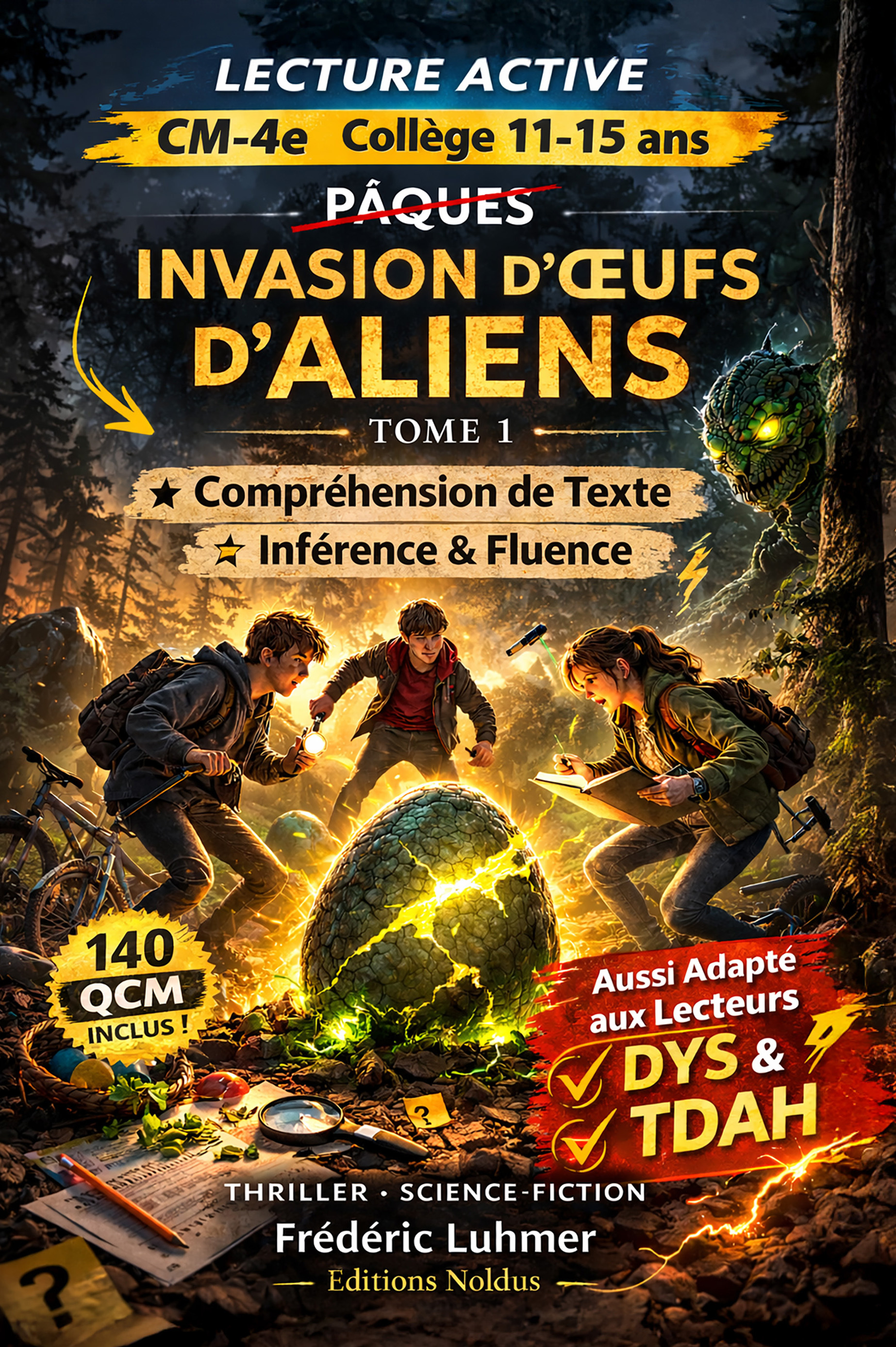 Édition pédagogique – Développe la fluence et la compréhension de texte.140 QCM de compréhension implicite et d’inférence.Et si votre enfant lisait… mais sans vraiment comprendre ?Au cœur d’une forêt municipale, des adolescents découvrent des œufs étranges.Alignés. Parfaits. Inquiétants.La zone est bouclée.Les adultes minimisent.Les preuves disparaissent.Quelque chose se prépare.Invasion d’Œufs d’Aliens – Tome 1 est un thriller de science-fiction captivant…mais surtout un entraînement structuré à la compréhension réelle.Cette édition pédagogique transforme la lecture en enquête active :140 QCM de compréhension10 questions après chaque chapitreTravail approfondi de l’inférenceTravail de la fluence des mots difficiles (MSO)Mise en page adaptée DYSFormat particulièrement efficace pour les profils TDA/HLe lecteur ne peut plus lire passivement.Il doit revenir au texte.Analyser.Comparer.Inférer.Chaque question oblige à réfléchir.Chaque réponse exige un raisonnement précis.La compréhension devient concrète.Mesurable.Visible.Adapté aux lecteurs DYS• Double espacement entre les mots• Police facilitant la reconnaissance visuelle• Taille confortable• Alignement à gaucheMoins de fatigue cognitive.Plus de fluidité.Plus de concentration sur le sens.Idéal pour les profils TDA/HLecture segmentée.Attention canalisée.Hyper-concentration activée par le défi des questions.Ce roman développe :• Compréhension fine• Inférence• Esprit critique• Vigilance aux détails• Raisonnement logiqueDes compétences indispensables au collège… et bien au-delà.Un thriller qui captive.Un outil qui fait progresser.Ne laissez plus la compréhension au hasard.