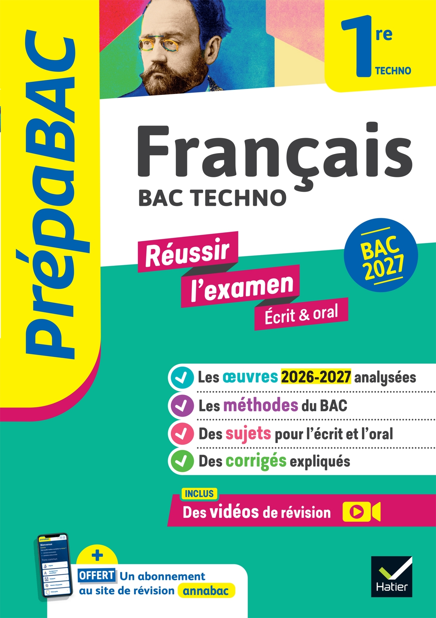 Un outil de travail complet et efficace, conforme au programme de français 2026-2027 en 1re technologique. De nombreuses ressources – fiches de cours, méthodes, cartes mentales, sujets corrigés –, pour préparer et réussir ton bac de français. Tout le programme en 8 chapitres • L’ouvrage couvre l’ensemble des thèmes utiles à la préparation du bac de français :– toutes les œuvres au programme du bac 2026-2027 en 1re technologique– les méthodes des épreuves (commentaire, contraction-essai, explication linéaire)– les outils grammaticaux • Au sein de chaque chapitre, tu révises étape par étape grâce à ces ressources :1. un test d’évaluation pour faire le point sur tes connaissances2. des fiches de cours structurées3. une carte mentale récapitulative4. des sujets de bac enrichis de rappels de méthode5. les corrigés expliqués pas à pas Inclus : des vidéos immédiatement accessibles via un QR codePour compléter le cours :– des vidéos sur les méthodes de la contraction-essai, du commentaire et de l’épreuve orale,– des cartes mentales animées sur les œuvres au programme. Gratuit, avec l’achat du livre : un abonnement au site de révision www.annabac.com• Dans chaque matière, sur chaque thème du programme de 1re, un parcours de révision interactif : avec des fiches, des quiz et des sujets corrigés.• Des conseils pour bien t’orienter.