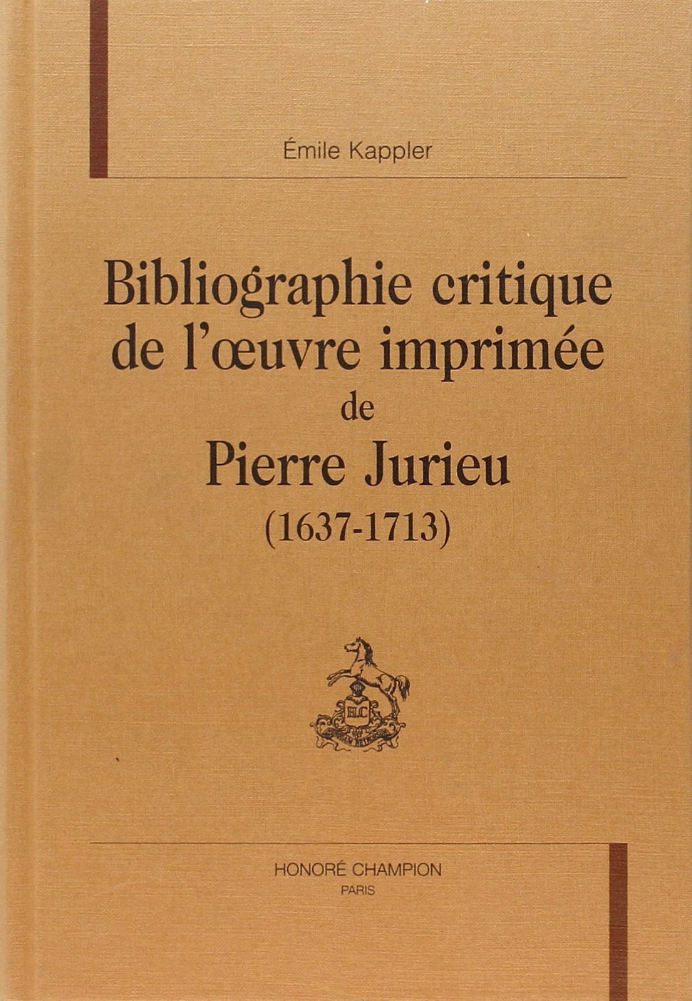 Cette étude monumentale et minutieuse d'Emile Kappler fut achevée peu de mois avant son décès le 8 juillet 1993 à l'âge de 82 ans.Pour chacune des soixante-treize œuvres imprimées de Pierre Jurieu (1637-1713), Emile Kappler fournit la description de l'ouvrage (titre, format, pagination, signature, empreinte), une rapide analyse du contenu, les localisations actuelles des exemplaires connus, les annotations manuscrites dans les exemplaires consultés, la liste des catalogues de bibliothèques privées où figure l'ouvrage en question, les références des comptes rendus et des commentaires de l'ouvrage, enfin la liste des écrits de controverse suscités par l'ouvrage. A cette bibliographie immense, il ajoute celle des œuvres faussement attribuées à Jurieu ou d'attribution douteuse et celle des ouvrages satiriques écrits contre Jurieu. Les annexes comportent la chronologie de la composition des ouvrages de Jurieu, la liste des imprimeurs, les statistiques de la diffusion géographique actuelle des exemplaires, la répartition dans les bibliothèques privées, la liste de tous ceux qui ont possédé des exemplaires des ouvrages de Jurieu, enfin la bibliographie générale des travaux cités.C'est un outil de travail unique que nous laisse ce grand spécialiste de l'histoire de la Réforme.