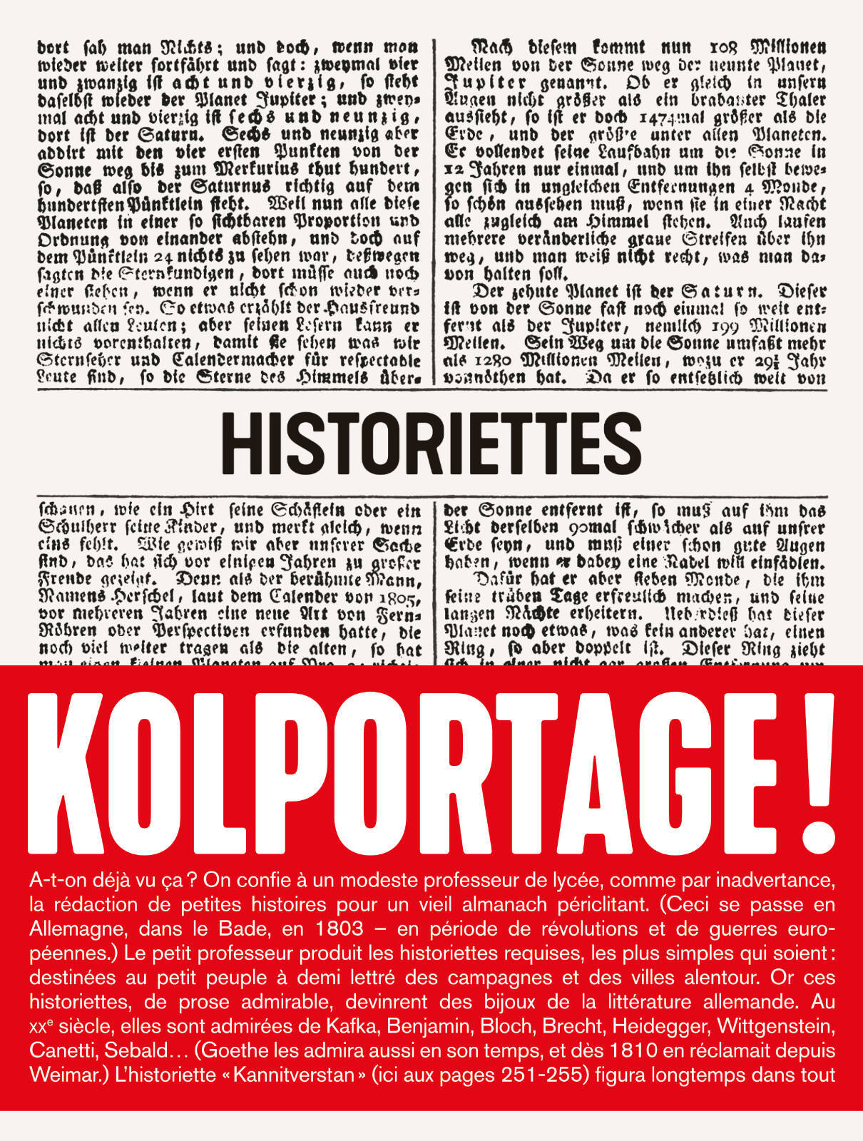 «Â Ainsi le conte dialectise le courage entre les pôles de la ruse et de l'insolence. » L'un des “conteurs” que Benjamin a en tête en écrivant ces lignes est précisément l'Allemand Johann Peter Hebel, auteur de plus de 300 historiettes produites pour un almanach que les autorités diffusaient dans le Bade, dans les années 1800-1810â?¦ Ces historiettes sont écrites dans une langue d'une vivacité et vitesse qui cherchent leur équivalent dans la littérature – et qui leur assurèrent l'admiration durable et forcenée des plus grands écrivains au siècle suivant : Kafka, Sebald.... (Public expressément visé par ces simples histoires : des lectrices et lecteurs situés entre sept ans et demi et la mort.)