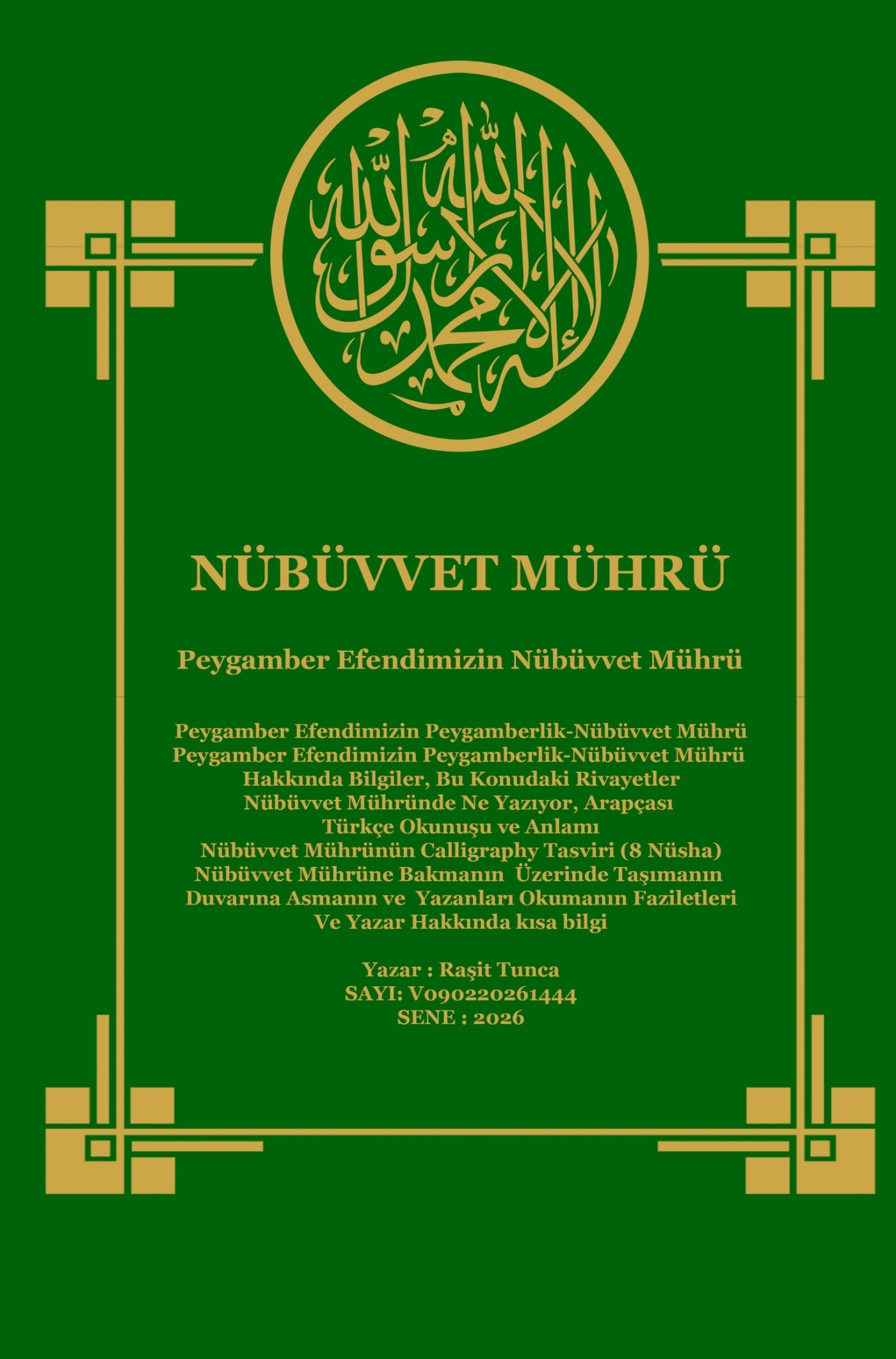 Peygamber Efendimizin Peygamberlik-Nübüvvet MührüPeygamber Efendimizin Peygamberlik-Nübüvvet Mührü Hakk nda Bilgiler, Bu Konudaki RivayetlerNübüvvet Mühründe Ne Yaz yor, Arapças Türkçe Okunusu ve Anlam Nübüvvet Mührünün Calligraphy Tasviri (8 Nüsha)Nübüvvet Mührüne Bakman n Uzerinde Tas man n Duvar na Asman n ve Yazanlar Okuman n Faziletleri1-Sabah ve aksam abdestli olarak bak l r. Kisinin isi rast gider.2-Eve çerçeve yap p as l r. Büyü, Cin ve Seytandan korunur.3-Yatmadan önce abdestli olarak bakarsa güzel rüya görür.4-Bolluk ve Bereket5-Yeni bir aya ve yeni y la girerken abdestli olarak bak l r.(Hicri Takvime göre)6-Kisi Ev sahibi olur. Tablo olarak uzun süre evde as l kal rsa7-Yolculuga ç kmadan önce bak l r.Rahat ve huzurlu geçer.8-Hasta kisi abdestli olarak mühre baks n9-Cuma Günü 80 Kere Bak ve Oku, Seksen senelik günahi olsa Allah affeder10-Cuma Günü Sabah namazindan hemen sonra ayaga kalkmadan Bak ve Oku, Seksen senelik günahi olsa Allah affeder. 1 senelik de ibadet yazarVe Yazar Hakk nda k sa bilgiYazar : Rasit TuncaSAYI: V090220261444SENE : 2026