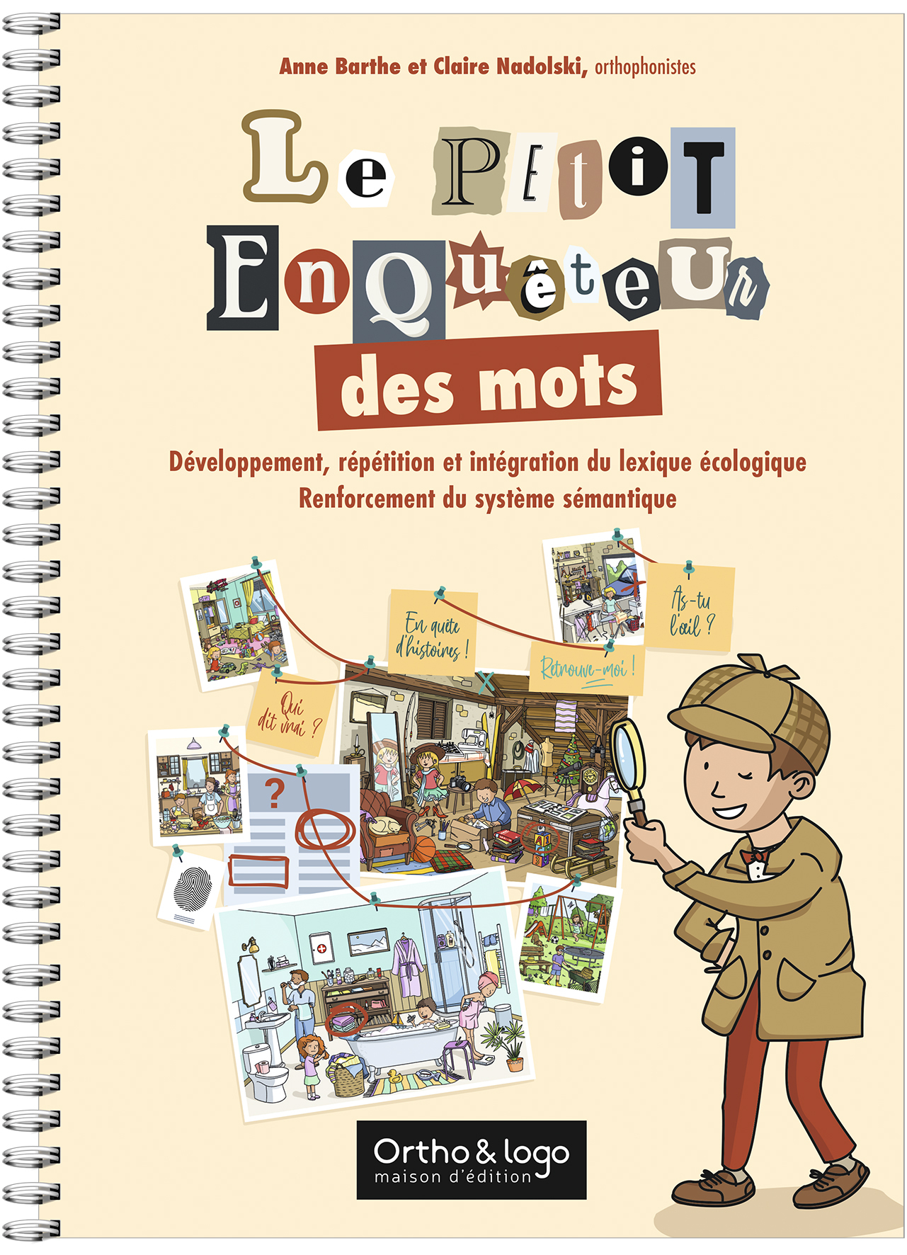 Le petit enquêteur des mots propose aux patients (enfants et adolescents) présentant un TDL plusieurs activités visant le développement, la répétition et l’intégration du lexique écologique et quotidien ainsi que le renforcement du système sémantique. Le petit enquêteur des mots aborde le monde domestique au travers de 7 espaces contenant chacun 11 activités. Chaque lieu cible 20 items répartis en 2 niveaux. L’orthophoniste est libre de sélectionner les planches à travailler et de les aborder dans l’ordre qu’il/elle juge pertinent pour son patient. Pour aller plus loin, 10 items supplémentaires ont été sélectionnés et abordés à travers 4 planches complémentaires. Espaces à visiter :La cuisineLa chambreLa salle de bainLe salon et la salle à mangerLa cave et le garageLe jardinLe grenierActivités d’enquête :Cherche et trouve : le grand classique qui plaît beaucoup !Bizarre ! : planche de cherche et trouve contenant 5 anomalies et 5 intrus à identifier en la comparant à la planche cherche et trouve de départ.Retrouve l’objet mystère ! : 12 silhouettes d’objets à identifier.Retrouve de quoi il s’agit ! : 20 images, 20 objets à identifier à partir des 4 indices lexico-sémantiques.Qui restera le dernier ? : 20 images, 20 phrases pour retrouver l’objet mystère en procédant par élimination.Qui va avec qui ? : 20 items à apparier sur le plan sémantique en les reliant.Retrouve le dernier mot ! : 20 fins de phrases automatiques (avec ou sans le support imagé).En quête d’histoires : 2 textes (un par niveau) à lire à double voix. Les items sont évoqués par l’enfant à partir d’images glissées dans le texte.Qui dit vrai ? : 20 phrases vrai/faux.Qui a disparu ? : 10 suites de 3 images dans la colonne de gauche. L’une d’entre elles a disparu dans la colonne de droite.À la recherche des 7 différences : à retrouver en comparant avec la planche cherche et trouve.Complément d’enquête : 10 items complémentaires à retrouver sur la planche cherche et trouve.Retrouve-moi ! : identifier l’item complémentaire à partir de définitions.Démêle le vrai du faux : 10 phrases vrai/faux portant sur les items complémentaires.As-tu l’œil ? : planche de cherche et trouve contenant 5 différences et 5 disparitions à identifier en la comparant à la planche cherche et trouve de départ.Deux outils additionnels sont téléchargeables sur le site orthoetlogo.fr :Les planches cherche et trouve en noir et blanc que l’orthophoniste pourra proposer au patient lors d’une activité de coloriage complémentaire.Les corrections de toutes les planches cherche et trouve pour faciliter leur repérage ou proposer une auto-correction au patient.Sortez votre carnet, votre loupe et un stylo ! Bonne enquête …