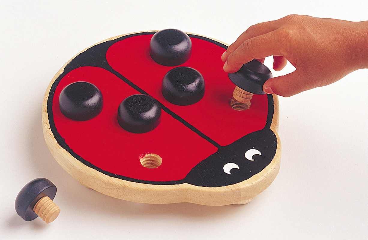 Coccinelle composée de 6 taches noires à visser. Coccinelle composée de 6 taches noires à visser. Les pas de vis sont tous identiques. Socle en bois posé sur des pieds. Conseil accompagnement du handicap : Les points noirs se vissent et se dévissent à l'infini pour développer l'agilité des doigts, du poignet et la précision du geste. La position symétrique des boulons permet un travail des deux mains de manière simultanée.