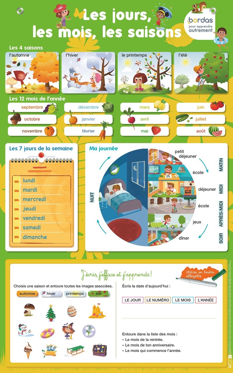 Aidez votre enfant à comprendre les saisons, les mois et les jours grâce à un poster clair, coloré et effaçable, idéal pour apprendre à se repérer dans le temps. Un poster grand format pour apprendre : > Les notions fondamentales du repérage dans le temps : - Les 4 saisons - Les 12 mois de l'année - Les 7 jours de la semaine - Les différents moments d'une journée > Une zone d'activités effaçable pour s'entraîner à : - Donner la date du jour - Associer des marqueurs temporels à une saison > Parfait pour un rituel quotidien (date du jour, évolution des saisons)