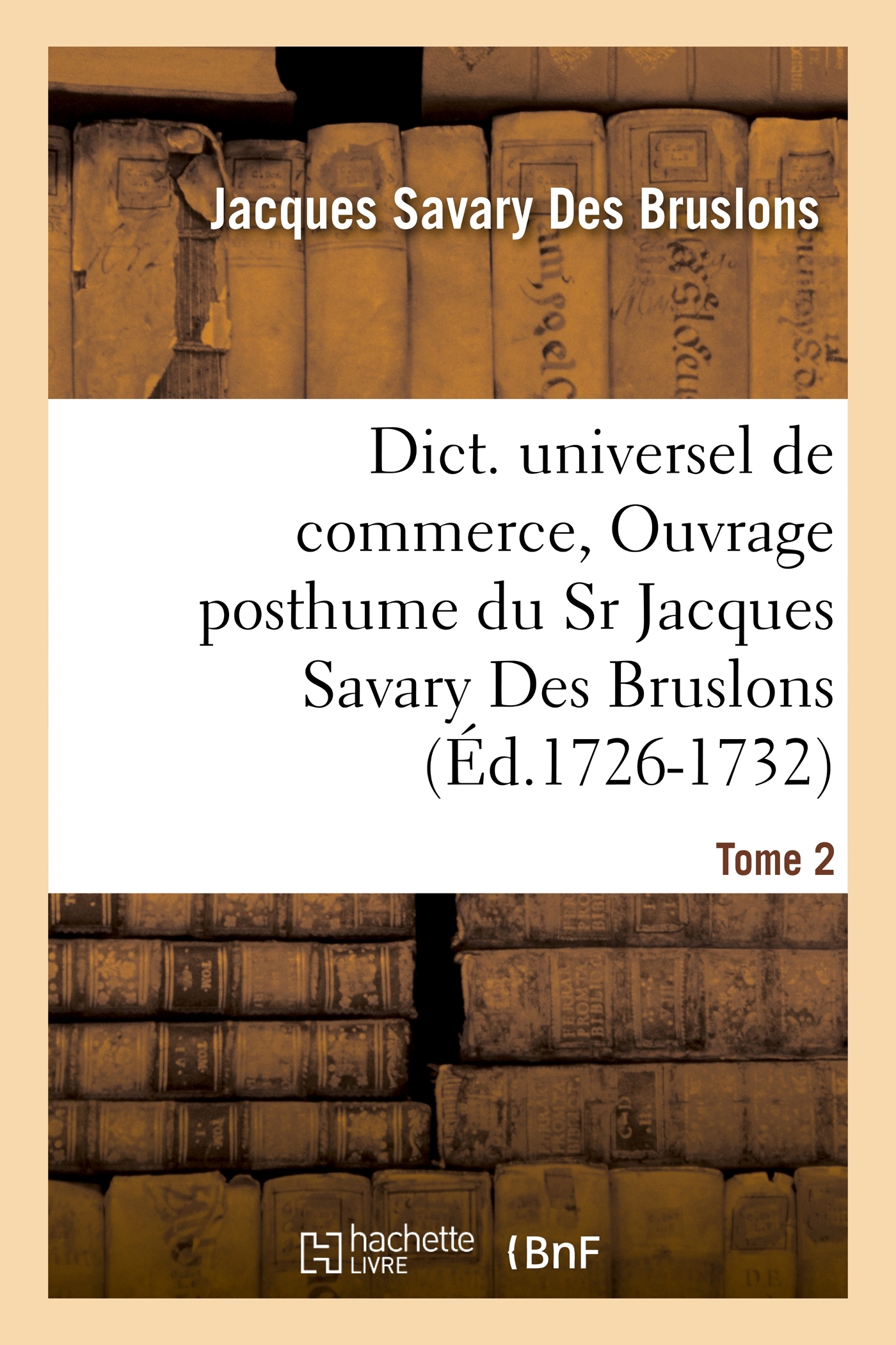 Dictionnaire universel de commerce, contenant tout ce qui concerne le commerce qui se fait dans les quatre parties du monde... Ouvrage posthume du Sr Jacques Savary Des Bruslons... continué... et donné au public, par Philémon-Louis Savary,.... Tome 2Date de l'édition originale : 1726-1732Le présent ouvrage s'inscrit dans une politique de conservation patrimoniale des ouvrages de la littérature Française mise en place avec la BNF.HACHETTE LIVRE et la BNF proposent ainsi un catalogue de titres indisponibles, la BNF ayant numérisé ces œuvres et HACHETTE LIVRE les imprimant à la demande.Certains de ces ouvrages reflètent des courants de pensée caractéristiques de leur époque, mais qui seraient aujourd'hui jugés condamnables.Ils n'en appartiennent pas moins à l'histoire des idées en France et sont susceptibles de présenter un intérêt scientifique ou historique.Le sens de notre démarche éditoriale consiste ainsi à permettre l'accès à ces œuvres sans pour autant que nous en cautionnions en aucune façon le contenu.Pour plus d'informations, rendez-vous sur www.hachettebnf.fr