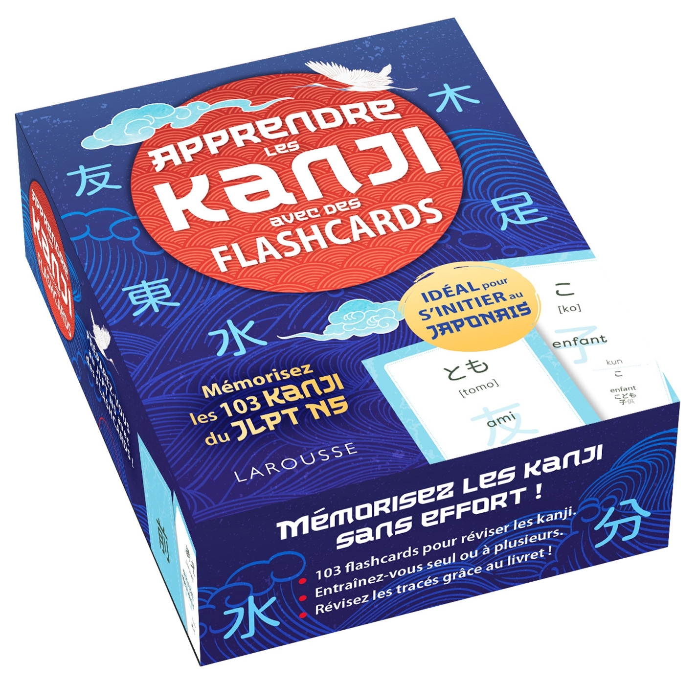 Révisez les kanji seul ou entre amis, grâce à 103 flashcards correspondant au premier niveau, le N5, du JLPT (Japanese Language Proficiency Test).Pour chaque kanji, sa traduction, sa transcription, et les différentes lectures qui peuvent être faites, ainsi que des exemples d'emploi.Avec un livret de 32 pages donnant le tracé des kanji.