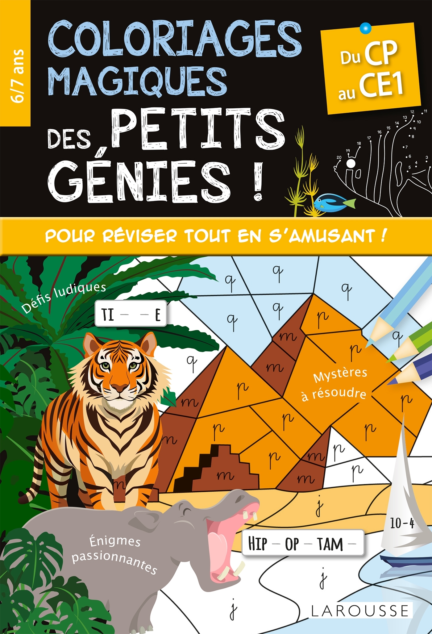 Pour tous les petits aventuriers du CP, les coloriages magiques des Petits génies proposent de nombreux coloriages à décoder et des jeux malins pour réviser tout en s’amusant.À chaque page, dinosaures, licornes, fées, animaux de la forêt et créatures fantastiques se révèlent peu à peu… à condition de bien suivre le code !• Colorie de la bonne couleur pour découvrir ce qui se cache derrière chaque grille et faire apparaître des scènesétonnantes.• Utilise tes connaissances en maths et en français pour résoudre des défis ludiques et des énigmes passionnantes