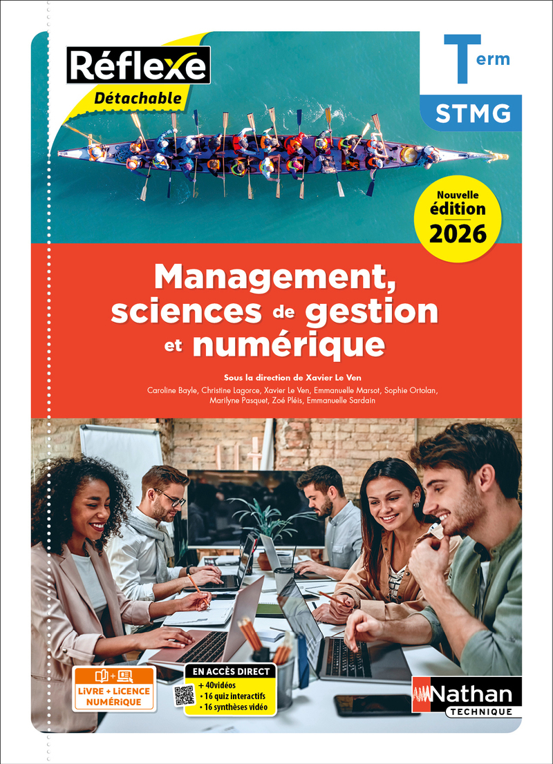 Cette pochette consommable, en Management, Sciences de gestion et numérique Term STMG, est découpée en 3 thèmes, en conformité avec le programme. Elle répond parfaitement aux différentes pratiques d'enseignement et permet une grande liberté pédagogique. Elle est proposée au choix en livre papier + licence numérique ou en licence 100% numérique. En version imprimée, cet ouvrage propose en complément une licence numérique Solaire pour mettre les élèves en activité sur ordinateur ou sur tablette. En cas de prescription à l'ensemble de la classe (20 élèves minimum), l'activation de la licence élève est laissée au libre choix de l'enseignant. Cette édition 2026, désormais dans la nouvelle maquette de la collection, propose de nouveaux contextes de chapitres (Lego, Le Bon Coin, Canal+, parc aquatique), des documents allégés et des schémas revus. Structure d'un chapitre • La mise en situation est accompagnée d'une vidéo " Avant la classe " pour découvrir le thème du chapitre. • La mise en situation, filée tout au long du chapitre , permet de découvrir les notions progressivement à partir de documents questionnés. • Une rubrique " Je prépare ma synthèse " propose des questions pour mettre en évidence l'essentiel et préparer les synthèses. • Les " Applications " , dont un quiz interactif , permettent de vérifier les connaissances, retravailler les notions dans des contextes différents et mettre en oeuvre la méthodologie. Des exercices de préparation au Grand oral sont également proposés. • Une nouvelle rubrique " J'auto-évalue mes capacités " permet de faire le point sur les capacités mobilisées dans les entraînements. • Une " Synthèse " schématique, également proposée au format vidéo, et un lexique récapitulent les notions. En + dans l'ouvrage • 4 sujets d'entraînement au Bac , dont 2 nouveaux. • Des fiches méthode . • Dans les chapitres de gestion, des fichiers à télécharger pour travailler sur les notions et des fichiers " Coups de pouce " , pour aider les élèves. • Un dossier ETLV avec 6 objets d'étude.