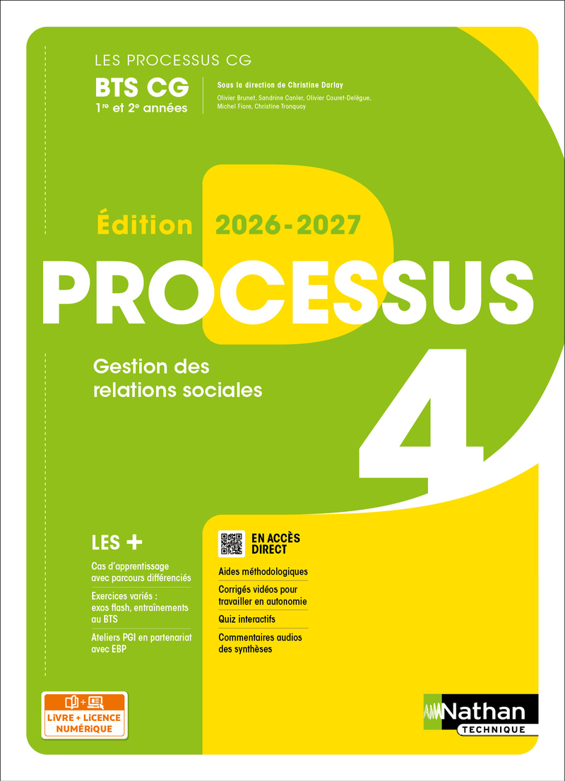Le Processus 4 - Gestion des relations sociales - BTS CG 1re et 2e années - Coll. Les Processus CG tient compte des dernières réglementations sociales. Il est actualisé avec les dernières données juridiques, sociales et fiscales. Il est proposé au choix en livre papier + licence numérique ou en licence 100% numérique. En version imprimée, cet ouvrage propose en complément une licence numérique Solaire pour mettre les élèves en activité sur ordinateur ou sur tablette. En cas de prescription à l'ensemble de la classe (20 élèves minimum), l'activation de la licence élève est laissée au libre choix de l'enseignant. Cet ouvrage propose une nouvelle approche du cas d'apprentis sage avec des contenus et des rubriques conçus pour faciliter la gestion de l'hétérogénéité des classes. Les chapitres sont construits autour d'une situation professionnelle filée associée à des compétences. Structure d'un chapitre Le cas d'apprentissage permet d'aborder les notions en contexte et d'acquérir les compétences à partir d'un cas concret. Il s'appuie sur : – une présentation du contexte ; – un questionnement progressif ; – des annexes (éléments de contexte) ; – des fiches ressources (éléments de savoir). 3 nouvelles rubriques pour les Processus 1 à 6 sont proposées dans le questionnement pour gérer l'hétérogénéité des classes : – " Besoin d'aide ? " : l'étudiant qui rencontre une diffi culté peut accéder (via un QR Code) à des supports téléchargeables pour faciliter le travail. – " La question de l'expert " : l'étudiant qui se sent plus à l'aise peut aborder une question additionnelle en autonomie et vérifier sa réponse grâce au corrigé en vidéo (via un QR Code). – " Discutons-en ! " : des sujets en lien avec la théma tique du chapitre et avec l'actualité viennent nourrir un temps d'échange en classe. Les fiches ressources claires, concises et détachables ont été allégées. Une nouvelle rubrique " L'essentiel en une question " propose un temps court de synthèse à réaliser en autonomie ou en classe. Pour clôturer chaque chapitre, une synthèse schématique récapitule l'essentiel des savoirs. Une version audio est proposée pour accompagner la lecture. Des applications variées permettent de mettre en oeuvre les compétences dans des contextes différents et d'approfondir le sujet du chapitre avec : – des " Exos Flash " dont un quiz numérique pour acquérir des mécanismes ; – des " Entraînements au BTS " avec plusieurs niveaux de difficulté pour préparer l'épreuve. Les compétences Pix et P7 abordées sont signalées. Également dans l'ouvrage 3 à 5 " Ateliers PGI " , en partenariat avec EBP, pour pratiquer les outils métier à partir des bases EBP Jupiter Media, Lacroix ou EBP ELITE Au vieux fournil (P1 à P6). Une présentation des épreuves et des conseils .