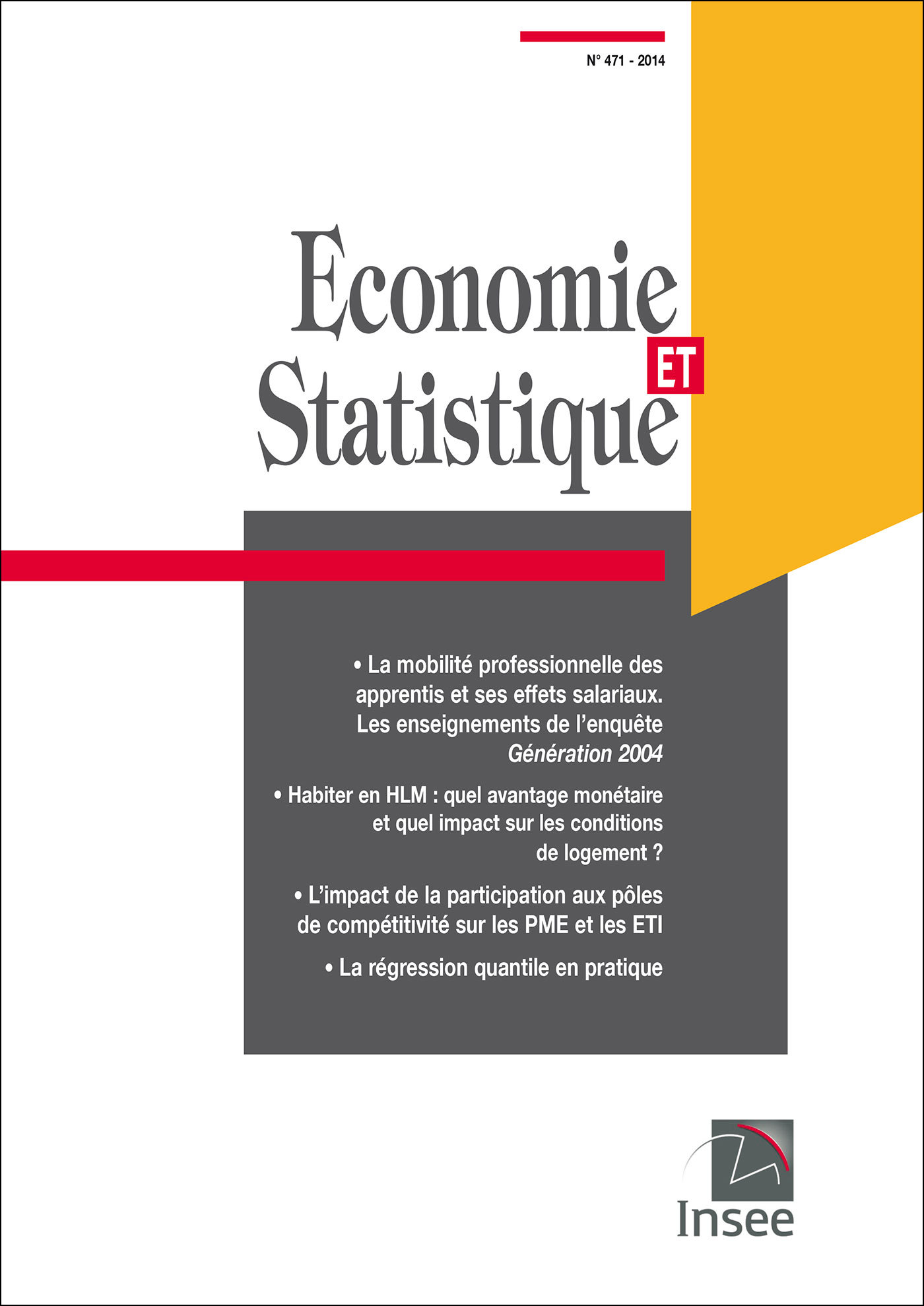 - Salaires et revenus - La mobilité professionnelle des apprentis et ses effets salariaux. Les enseignements de l'enquête Génération 2004 (À la fin de leur contrat d'apprentissage, les apprentis changent souvent d'entreprise. Cette mobilité résulte à la fois de décisions individuelles et de mécanismes de sélection de la part des employeurs. Son impact sur les trajectoires salariales des apprentis est étudié ici. ) - Conditions de vie - Habiter en HLM : quel avantage monétaire et quel impact sur les conditions de logement ? (Les logements sociaux offrent des loyers très inférieurs au secteur privé. Les ménages qui les occupent bénéficieraient ainsi d'un avantage implicite de 261 euros par mois, entraînant une forte augmentation de la consommation ou de l'épargne mais aussi une modification des conditions de logement.) - Entreprises - L'impact de la participation aux pôles de compétitivité sur les PME et les ETI (Les PME et ETI des pôles de compétitivité ont pu bénéficier d'aides publiques à la R&D spécifiques. Nous montrons que ces entreprises ont augmenté leurs dépenses de R&D et que cette augmentation est équivalente au supplément d'aides reçu sous forme de subventions et de crédit d'impôt recherche.) - Méthodologie - La régression quantile en pratique (Les régressions quantiles permettent de modéliser l'ensemble de la distribution conditionnelle d'une variable d'intérêt en fonction de déterminants observables. Cet article en propose une introduction illustrée par des exemples concrets qui mettent l'accent sur l'interprétation des résultats.)