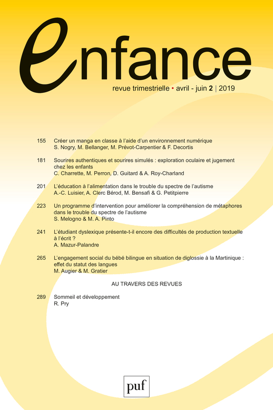 Comprendre tous les développements de l'enfantEnfance est une revue scientifique trimestrielle qui publie des articles consacrés à l’enfant et à son développement. Les domaines d’exploration sont divers : ils concernent le développement moteur, senso...