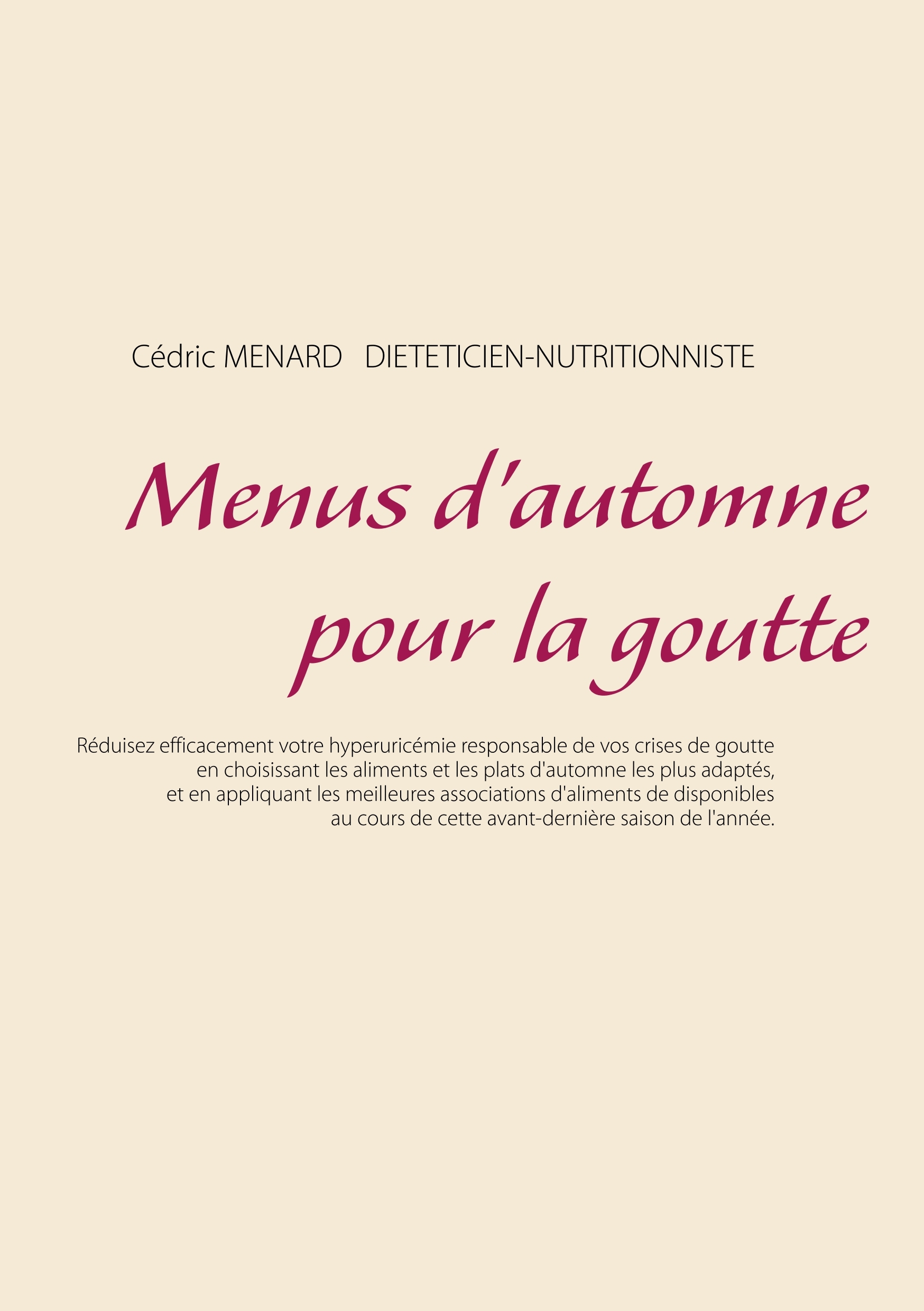 Cet ouvrage est dédié à toutes les personnes souffrant de la goutte, et il offre aux détenteurs des ouvrages du même auteur : « Quelle alimentation pour la goutte ? » et « Recettes et menus pour la goutte » un ouvrage parfaitement complémentaire. L'auteur vous propose trois mois de menus spécifiquement adaptés à votre goutte, tous très simples à mettre en pratique grâce à des plats, des légumes et des fruits d'automne qui vous sont proposés, vous permettant ainsi de mieux adapter votre alimentation à votre pathologie. Un ouvrage diététique de référence pour celles et ceux qui souhaitent éviter les crises de goutte grâce à leur alimentation !