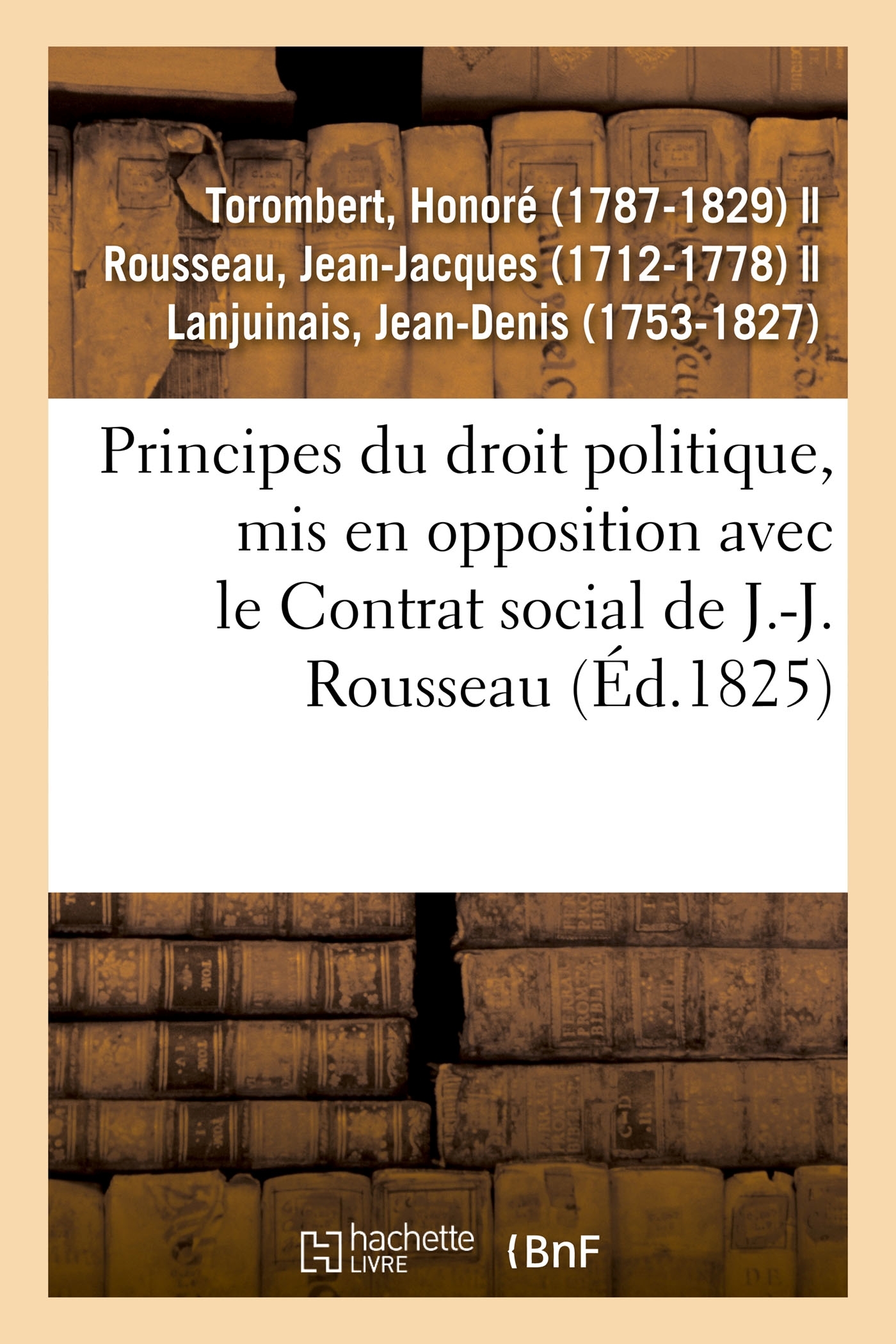 Principes du droit politique, mis en opposition avec le Contrat social de J.-J. Rousseau ; par Honoré Torombert,... avec la Réfutation du chapitre intitulé "De la Religion civile", par M. Lanjuinais,... suivis du texte entier du Contrat socialDate de l'édition originale : 1825Le présent ouvrage s'inscrit dans une politique de conservation patrimoniale des ouvrages de la littérature Française mise en place avec la BNF. HACHETTE LIVRE et la BNF proposent ainsi un catalogue de titres indisponibles, la BNF ayant numérisé ces oeuvres et HACHETTE LIVRE les imprimant à la demande. Certains de ces ouvrages reflètent des courants de pensée caractéristiques de leur époque, mais qui seraient aujourd'hui jugés condamnables. Ils n'en appartiennent pas moins à l'histoire des idées en France et sont susceptibles de présenter un intérêt scientifique ou historique. Le sens de notre démarche éditoriale consiste ainsi à permettre l'accès à ces oeuvres sans pour autant que nous en cautionnions en aucune façon le contenu. Pour plus d'informations, rendez-vous sur www.hachettebnf.fr
