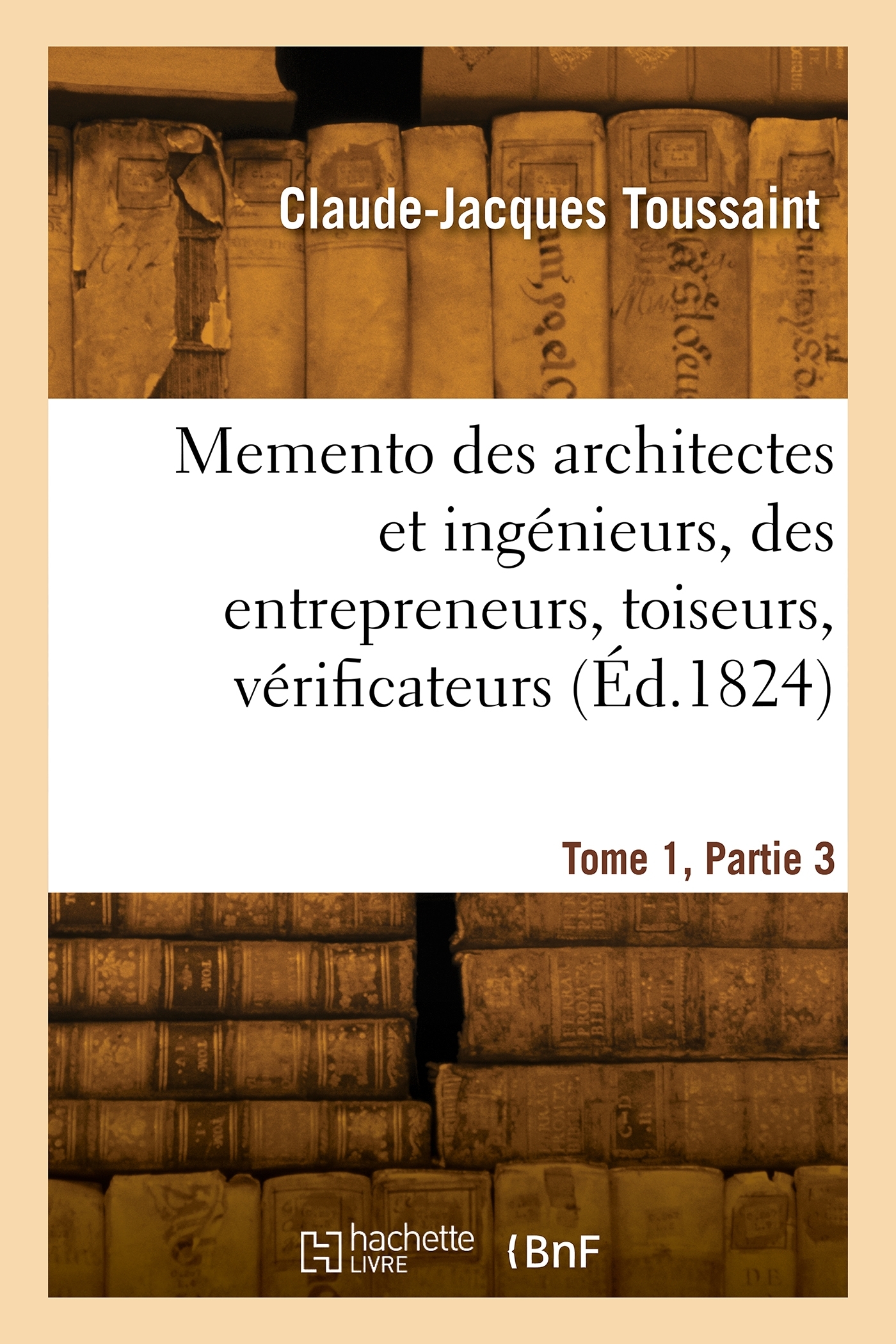 Memento des architectes et ingénieurs, des entrepreneurs, toiseurs, vérificateurs et des personnes qui font bâtir.... Tome 1,Partie 3 / . Par C.-J. Toussaint,... Tome premier. Première partie. [-tome troisième]Date de l'édition originale : 1824-1838Le présent ouvrage s'inscrit dans une politique de conservation patrimoniale des ouvrages de la littérature Française mise en place avec la BNF. HACHETTE LIVRE et la BNF proposent ainsi un catalogue de titres indisponibles, la BNF ayant numérisé ces oeuvres et HACHETTE LIVRE les imprimant à la demande. Certains de ces ouvrages reflètent des courants de pensée caractéristiques de leur époque, mais qui seraient aujourd'hui jugés condamnables. Ils n'en appartiennent pas moins à l'histoire des idées en France et sont susceptibles de présenter un intérêt scientifique ou historique. Le sens de notre démarche éditoriale consiste ainsi à permettre l'accès à ces oeuvres sans pour autant que nous en cautionnions en aucune façon le contenu. Pour plus d'informations, rendez-vous sur www.hachettebnf.fr