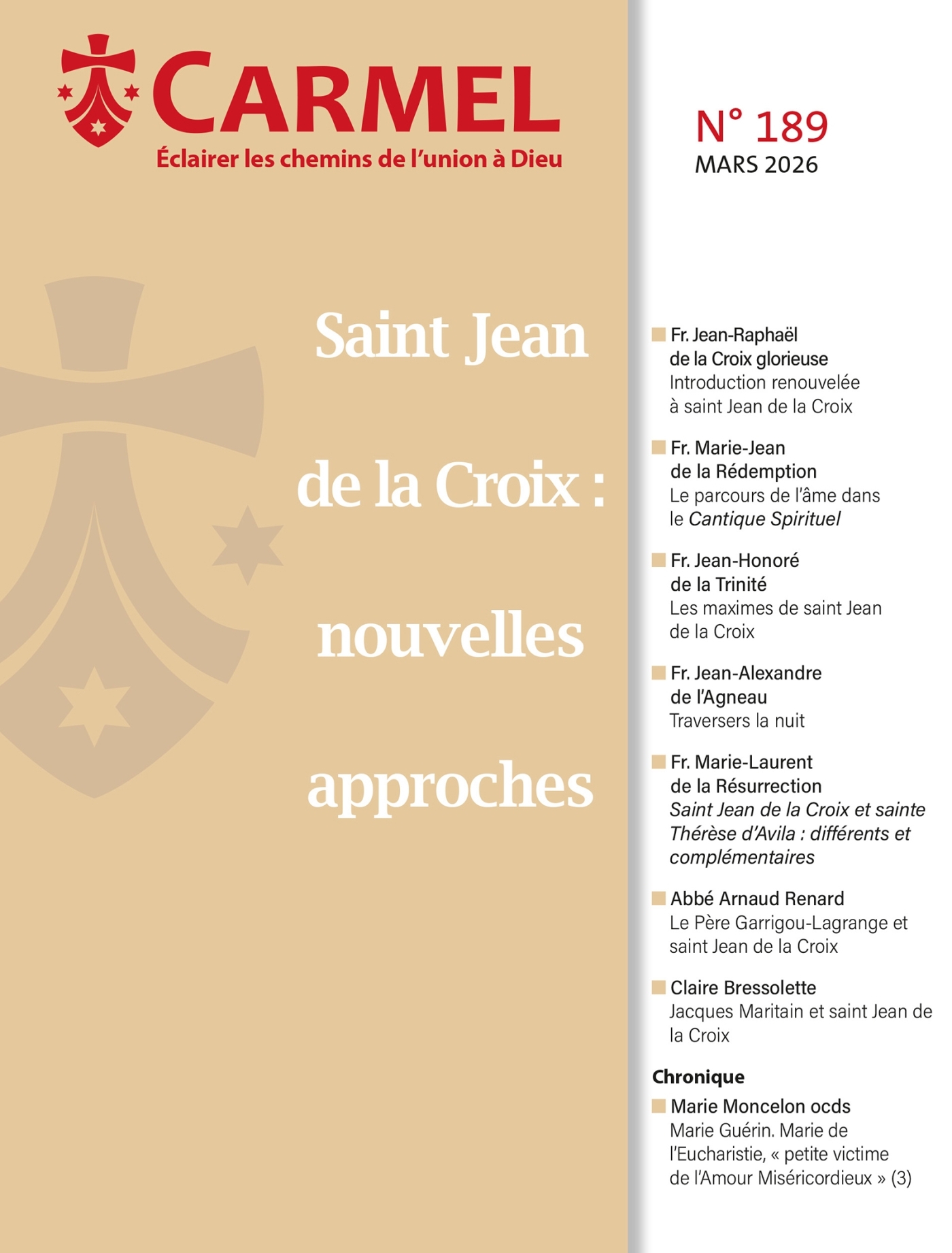 Dans ce numéro, la revue Carmel vous invite à redécouvrir saint Jean de la Croix, maître spirituel universel et guide sûr de la prière.Trop souvent méconnu ou jugé difficile, il se révèle pourtant proche et lumineux. Poète inspiré, compagnon de sainte Thérèse d’Avila, il nous prend par la main pour nous conduire sur le chemin de l’oraison. Ses poèmes et ses maximes apprennent à tourner notre cœur vers Dieu, pour aimer en Lui et par Lui sans nous égarer.Surtout, il éclaire les moments de crise qui jalonnent toute vie humaine – épreuves personnelles, familiales ou professionnelles – en les révélant comme des passages féconds et porteurs de grâce. Ce numéro montre comment ses enseignements, loin d’être réservés à quelques initiés, offrent aujourd’hui à chacun une source de paix, de force et de lumière pour traverser l’obscurité et transformer l’épreuve en bénédiction.