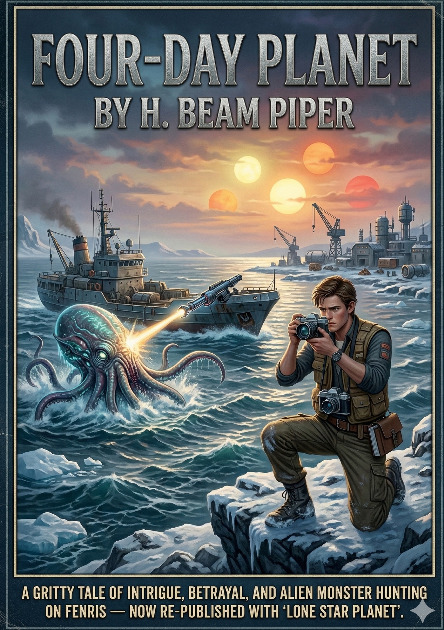 Reminiscent of old whaling stories, Four-Day Planet follows the story of Walter Boyd, a scrappy 17-year-old reporter working for his father at the Port Sandor Times. Walt gets tied up in the adventures of the sea-monster hunters on Fenris—a barely-habitable planet with a 2,000-hour day. The prized—and only—commodity on Fenris is tallow-wax, a miraculous material harvested from the dangerous seas of the planet.While being set in a grand sci-fi universe, the book packs in more about intrigue, betrayal, and the grit required to survive on a backwater planet of the Federation. The book was later re-published as a "two-for-one" with Lone Star Planet (originally titled A Planet for Texans).