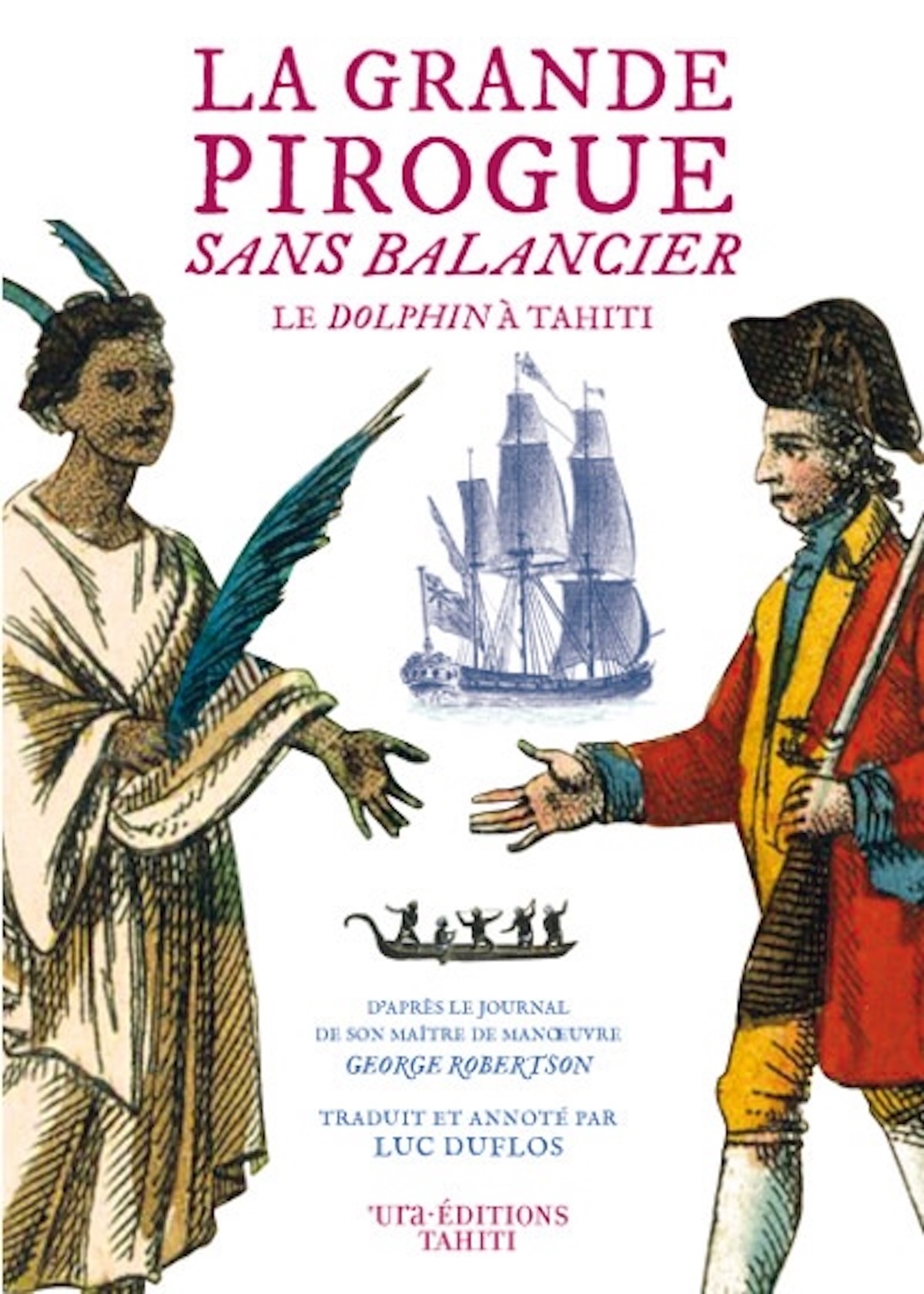 20 juin 1767. Le capitaine Wallis et son équipage découvrent, par temps brumeux, lapresqu’île de Taiarapu, et pensent apercevoir, plus loin dans les nuages, « la cime de plusieurs monts, qui s’étendaient du S au SO, à plus de vingt lieues ». Il s’agissait dans leur esprit de la Terra Australis incognita, continent chimérique qui occupait alors l’imagination de tous les marins traversant le Pacifique. De leur côté, les Tahitiens suivaient, depuis son arrivée à Mehetia, cette grande pirogue sans balancier.Méfiance d’un côté, préjugés d’époque de l’autre, firent de cette première rencontre un affrontement sanglant, les Peretane répondant aux jets de pierres par leurs canons chargés à boulet et mitraille. Il fallut toute la diplomatie de la « Reine Purea», et la bienveillance naturelle des Tahitiens, pour surmonter ce premier échec et le transformer en une relation d’amitié.Samuel Wallis, commandant la frégate Dolphin, fut le premier Européen à y aborder. Mais souffrant de ce que l’on appelait alors « le mal des vaisseaux », il ne put quitter sa cabine pendant une bonne partie du séjour dans l’île. Heureusement son maître de manœuvre, George Robertson, bien qu’il ne fût pas “gentleman” mais officier sorti du rang, avait une certaine éducation, et surtout un regard et une plume : ses descriptions des premiers contacts – des premiers regards – entre Européens et Polynésiens sont d’autant plus précieux qu’ils sont empreints d’une véritable humanité. Cette traduction du journal quotidien de George Robertson relate le périple du Dolphin entre le 1er juin et le 27 juillet 1767, depuis l’approche des Tuamotu du sud-ouest jusqu'à l’arrivée à Tahiti, et son séjour d’un peu plus d’un mois en baie de Matavai. Ce qu’ignoraient les marins de Sa Majesté Britannique, c’est que le Dolphin réalisait ainsi la prophétie de Vaita grand prêtre de Raiatea, qui avait – lors d’une transe visionnaire – annoncé la venue d’une grande pirogue sans balancier.