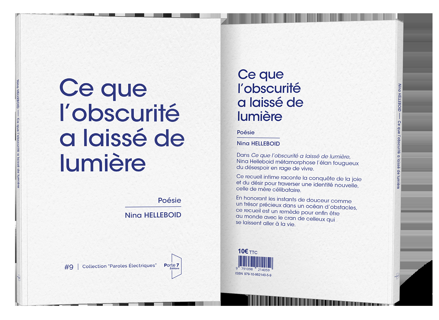 Dans Ce que l’obscurité a laissé de lumière,Nina Helleboid métamorphose l’élan fougueuxdu désespoir en rage de vivre.Ce recueil intime raconte la conquête de la joieet du désir pour traverser une identité nouvelle,celle de mère célibataire.En honorant les instants de douceur commeun trésor précieux dans un océan d’obstacles,ce recueil est un remède pour enfi n êtreau monde avec le cran de celleux quise laissent aller à la vie.